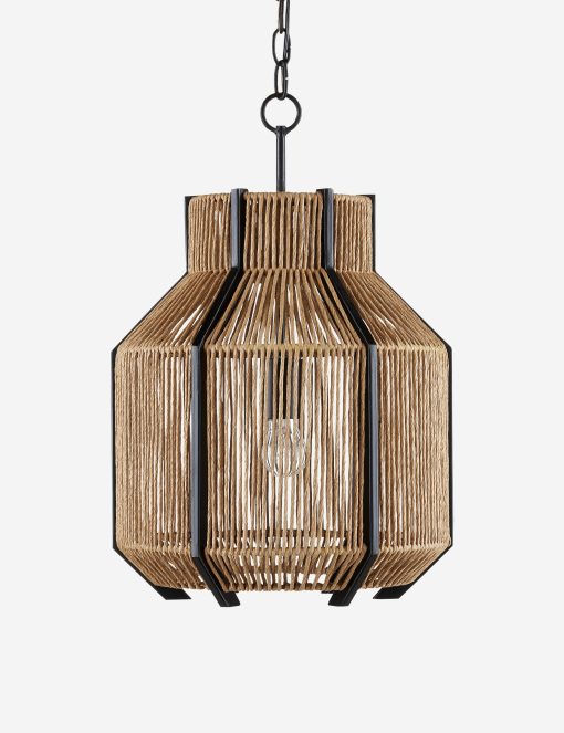 Artisan textures blend with modern elements in this eye-catching pendant light. The warmth of the twine brings a grounding touch to the sleek, wrought iron frame elevating both materials in an angular design. We love this pendant light for a grounding touch that can blend seamlessly into a modern space.