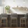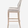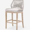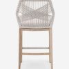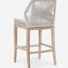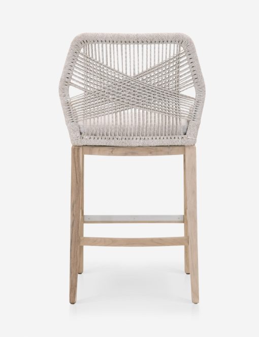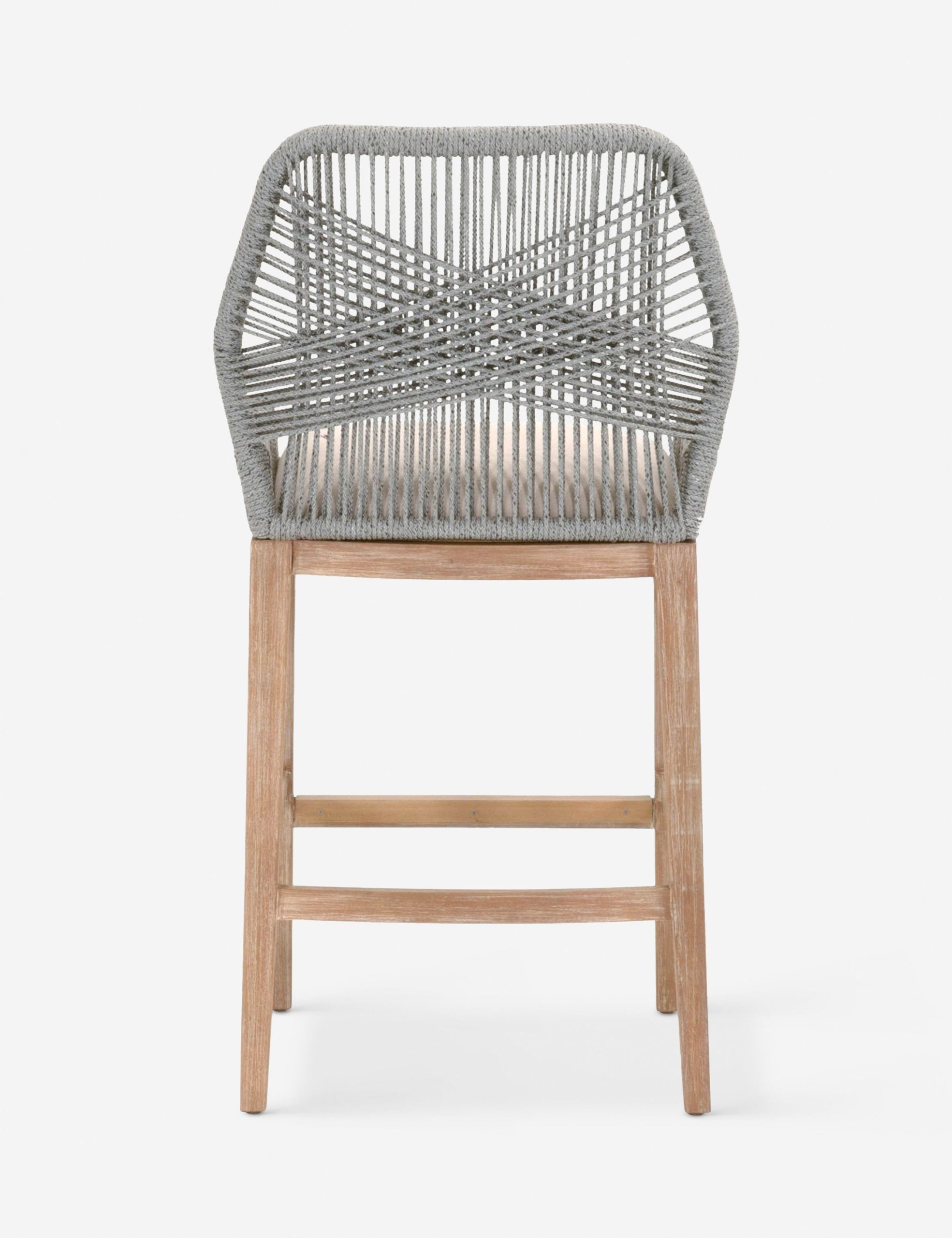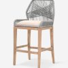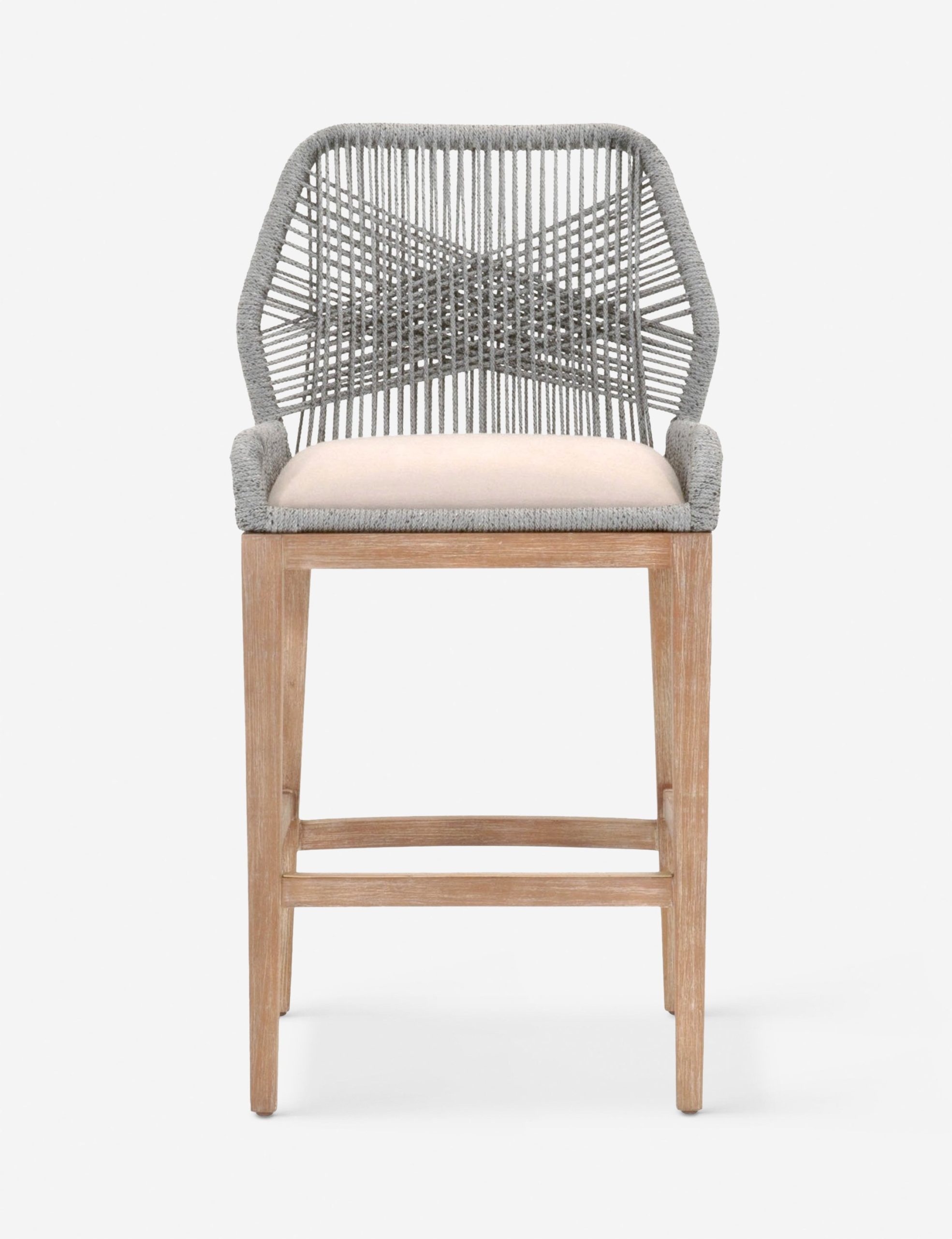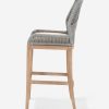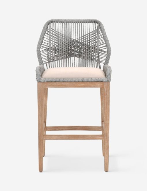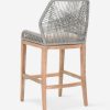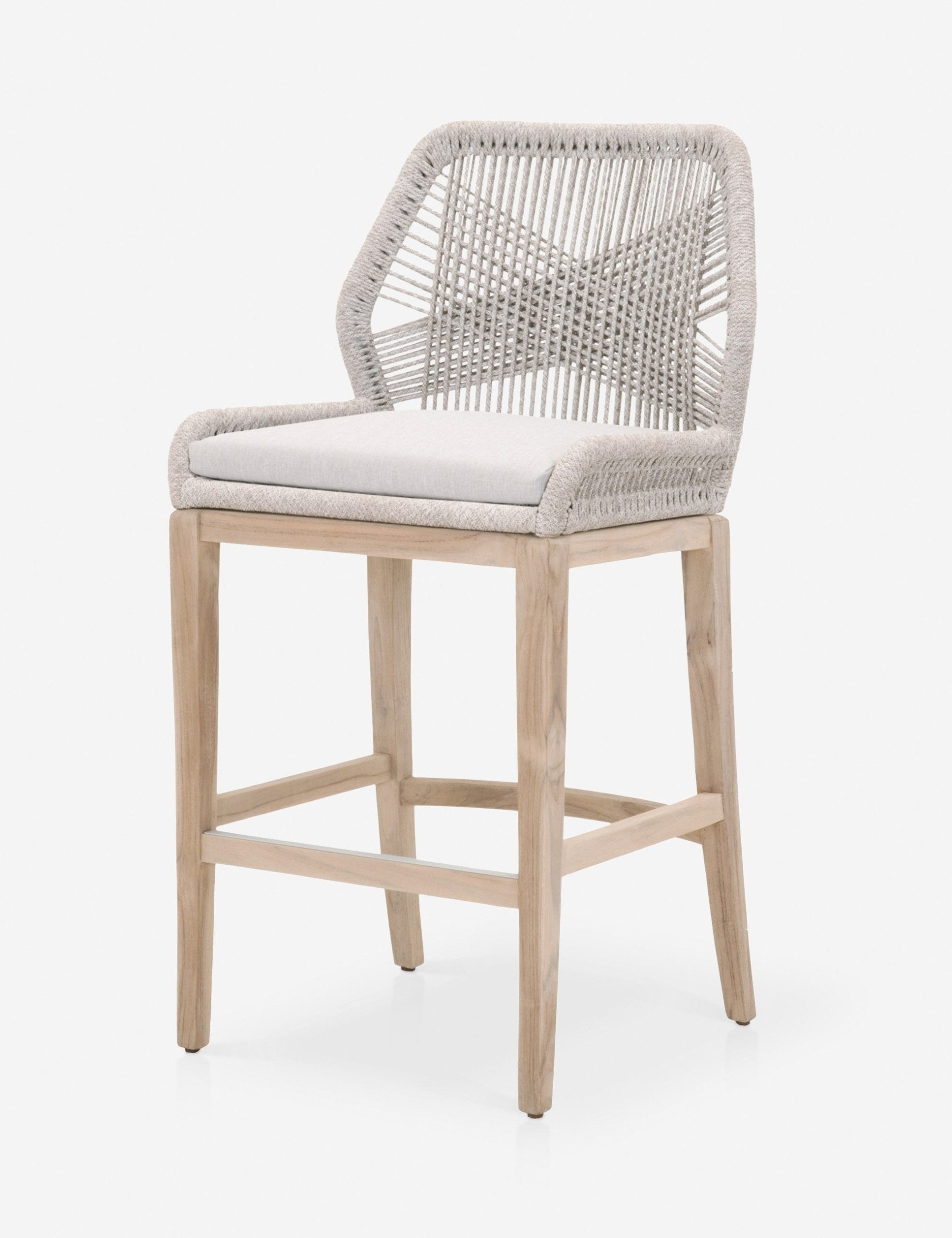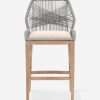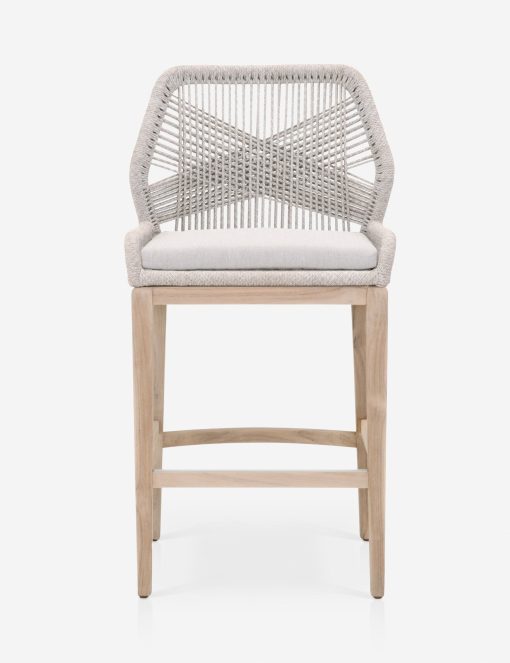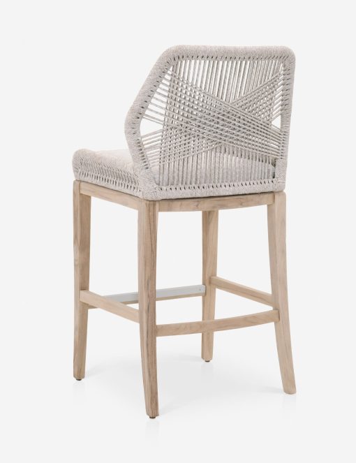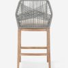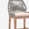 This London bar stool seamlessly combines a unique loom woven design, high-quality mixed materiality, and cozy touches to bring laid-back coastal style to your kitchen, terrace, or patio. A durable and sturdy teak wood base sits below a wrapped aluminum frame that showcases the intricately woven pattern. It is finished with an all-weather cushion in pumice gray for a tonal look.