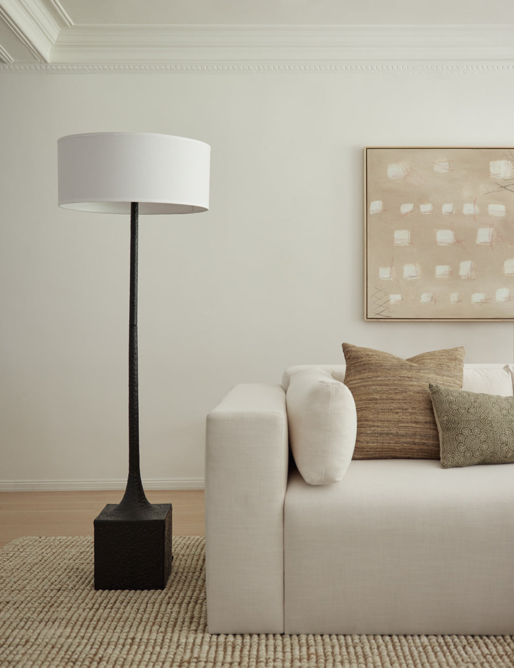 Slim-lined and featuring a cubic-shaped base, this floor lamp brings a touch of industrial style to your space. Its antiqued bronze and textural finish is strikingly offset by a round linen shade, so you can curate a number of spacesâlike a reading nook or sitting areaâwith this versatile lamp.