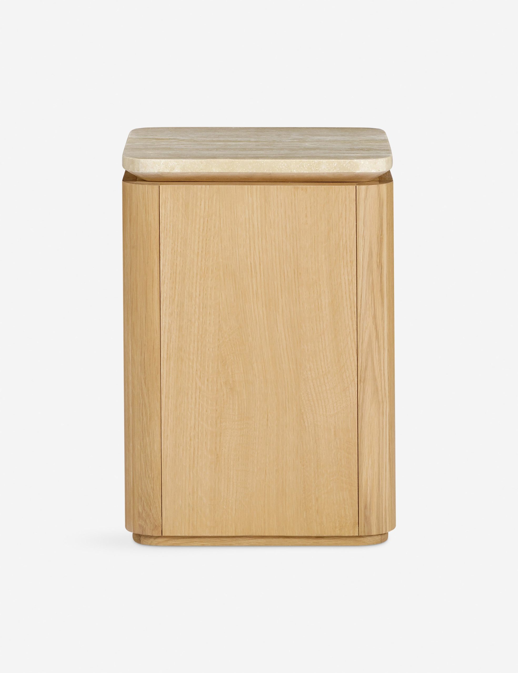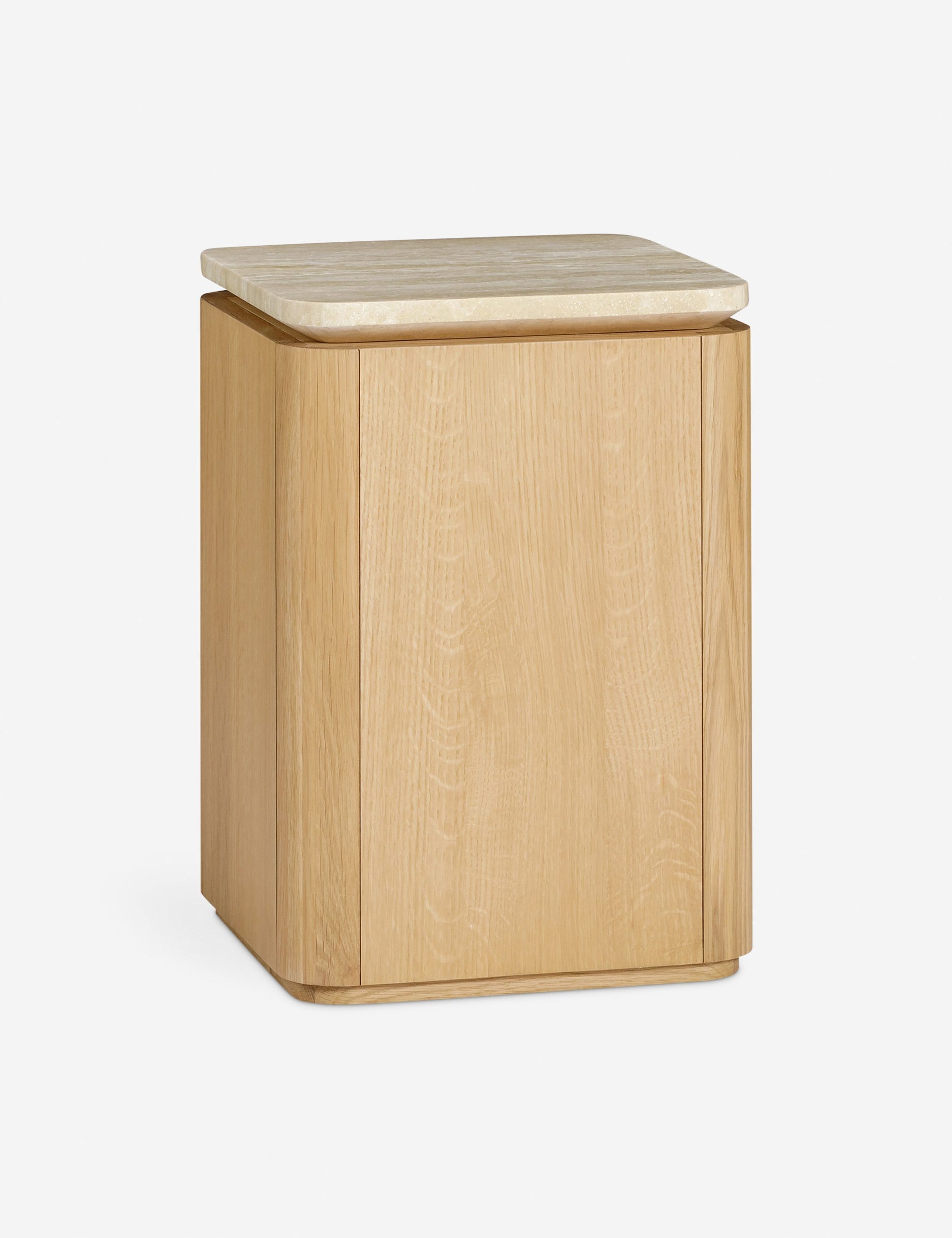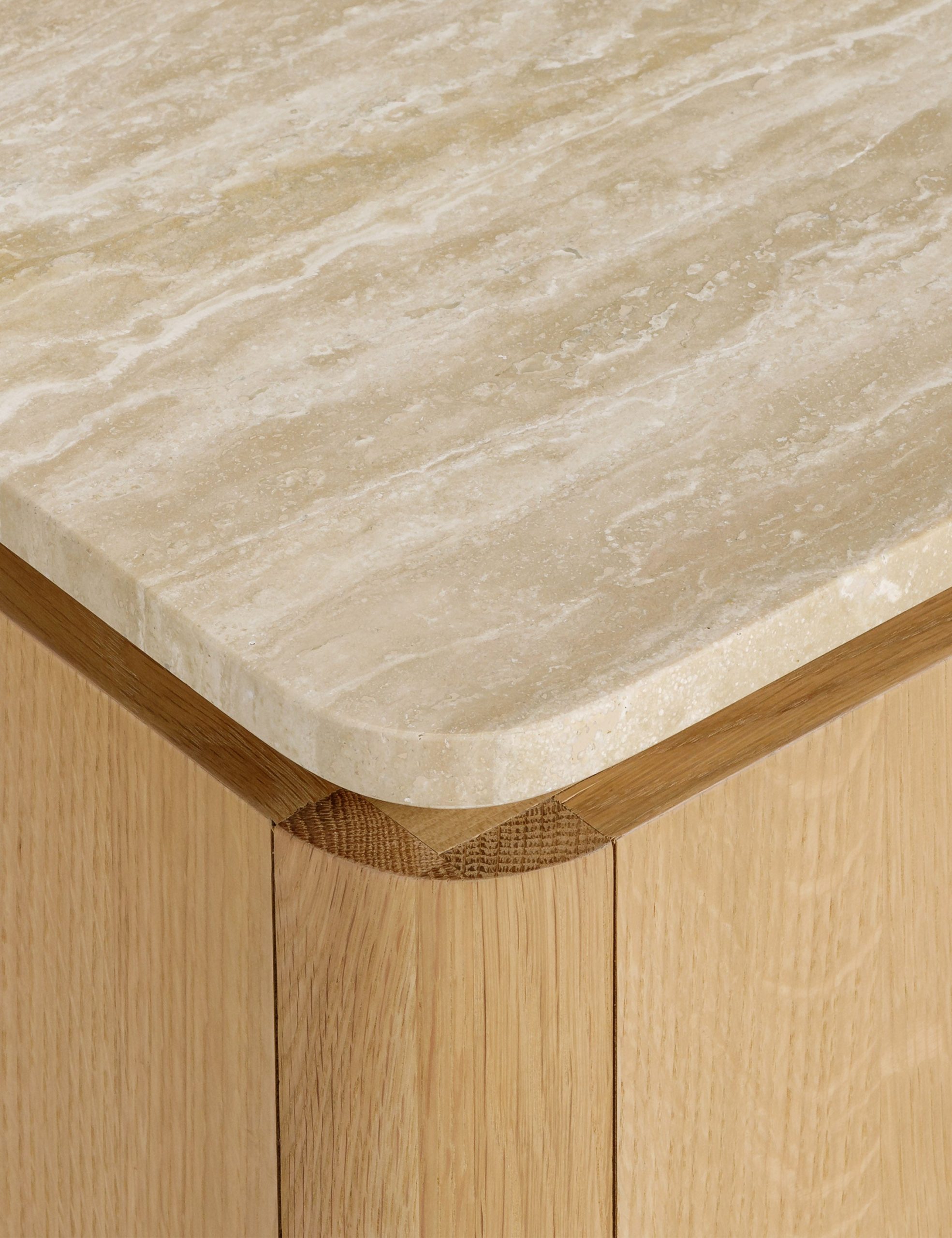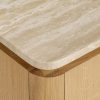 Bring a grounding touch to your space with the Kari side table. The mixed material design features natural oak grain with a travertine top for a clean, organic feel. With its minimalist lines and warm character, this end table offers a versatile accent piece for modern decor.