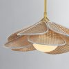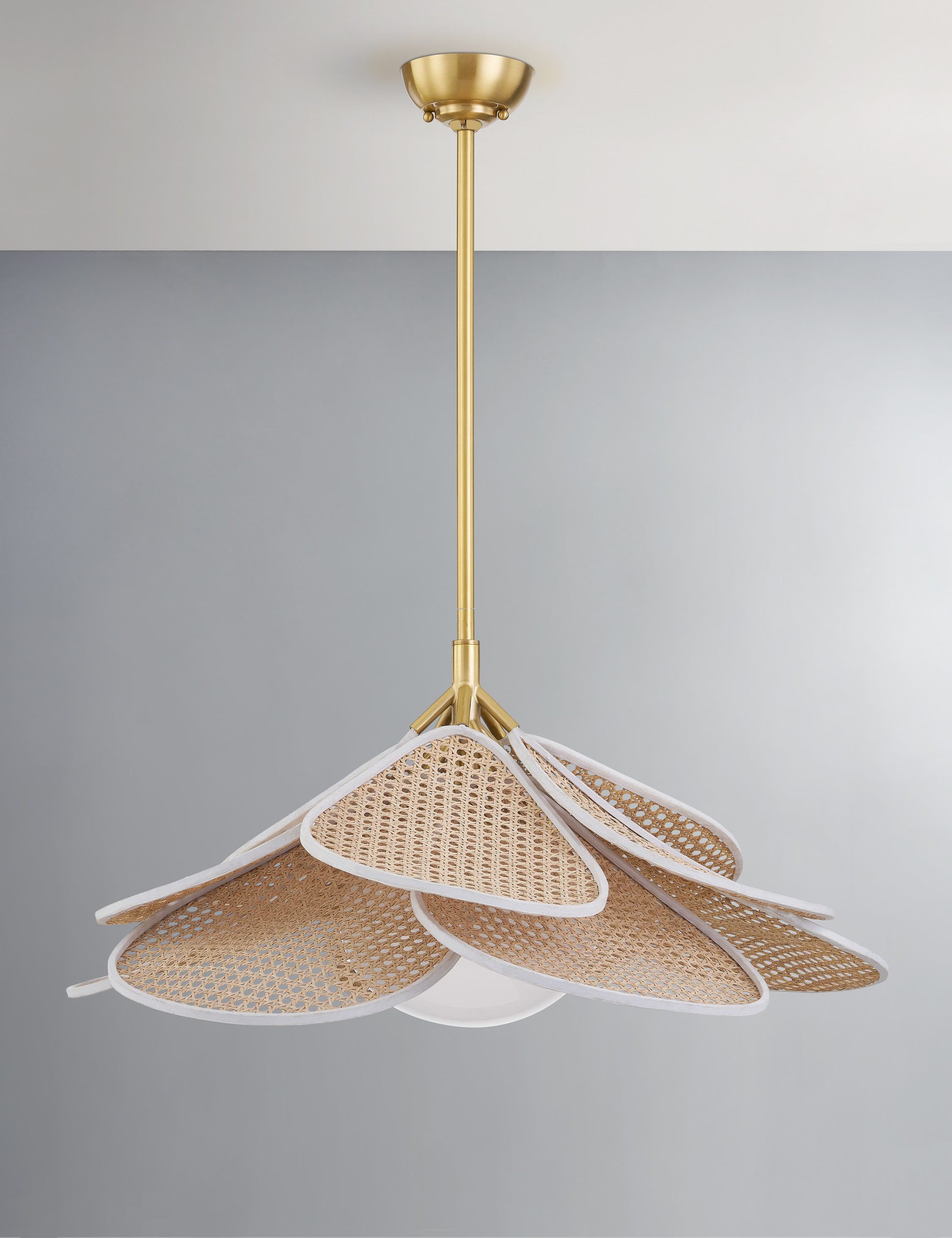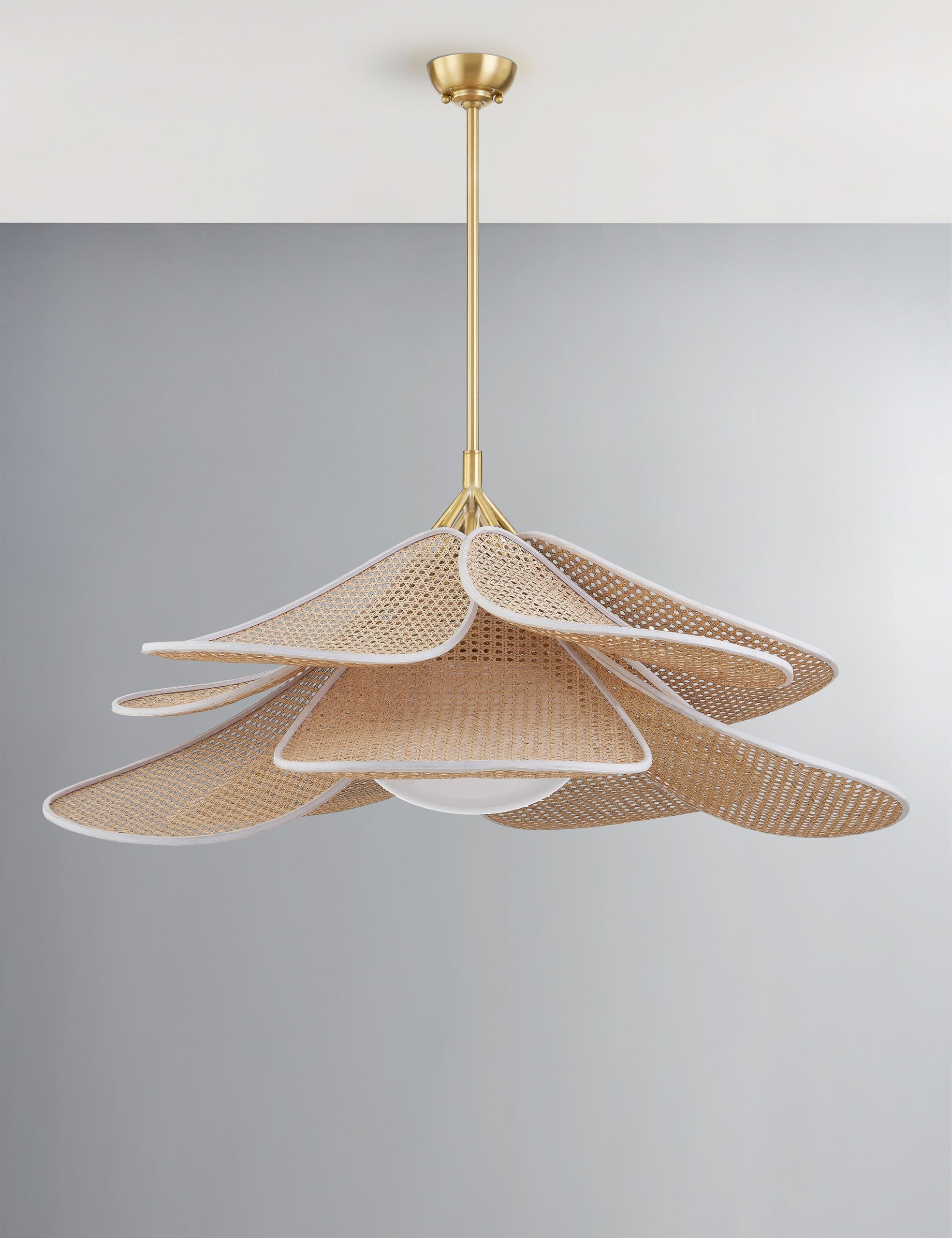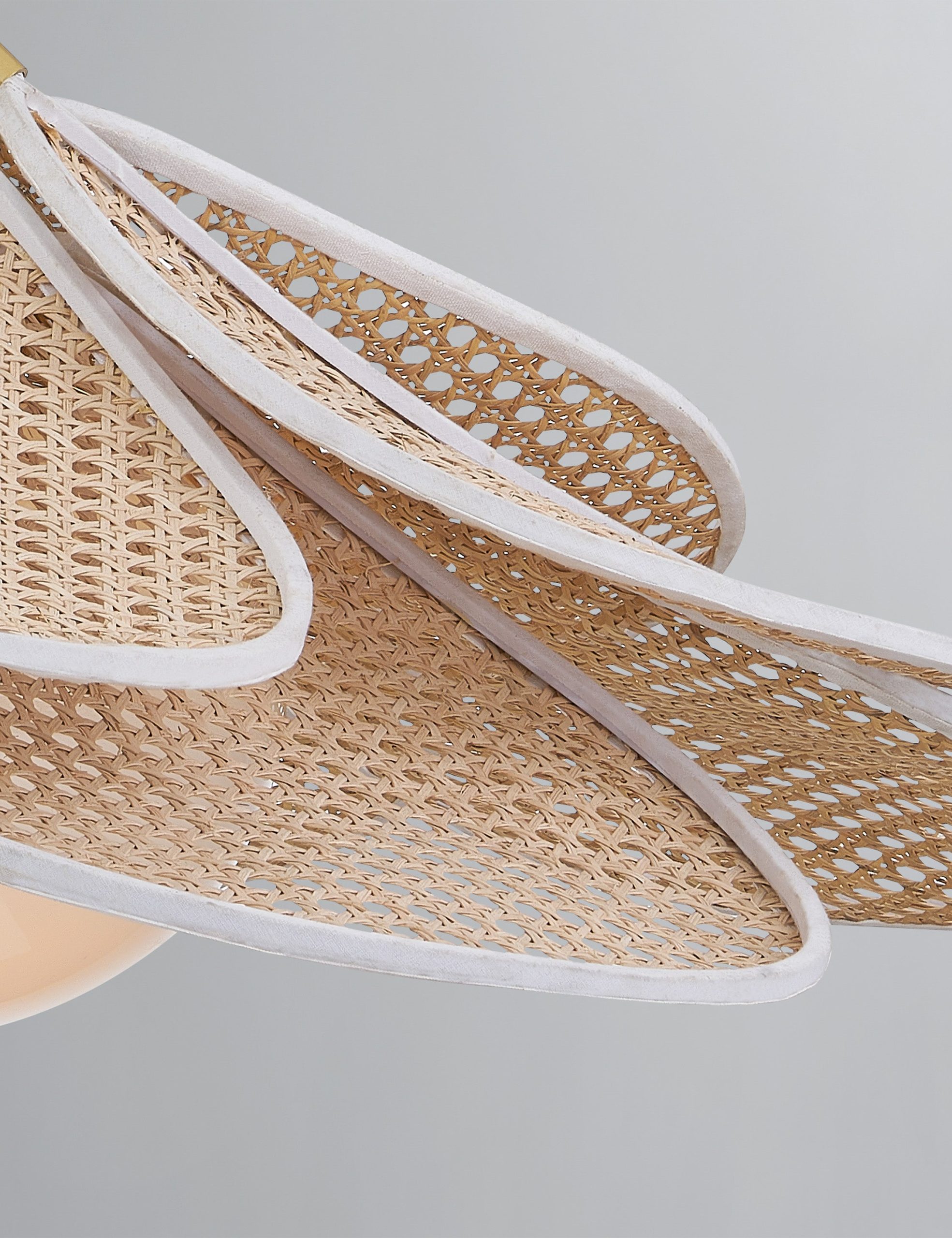 Create a sense of whimsy and texture overhead with this eye-catching pendant. The opal glass globe is layered in petal-like shades fashioned from rattan and trimmed in cottonâoffering a floral-inspired pendant light perfect for a bright and airy space.