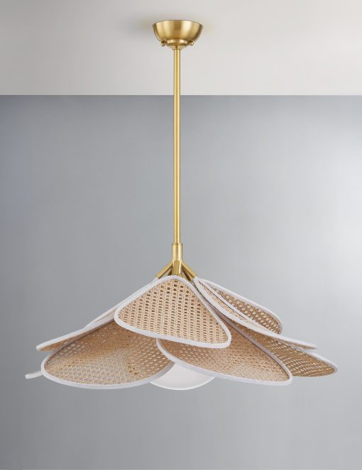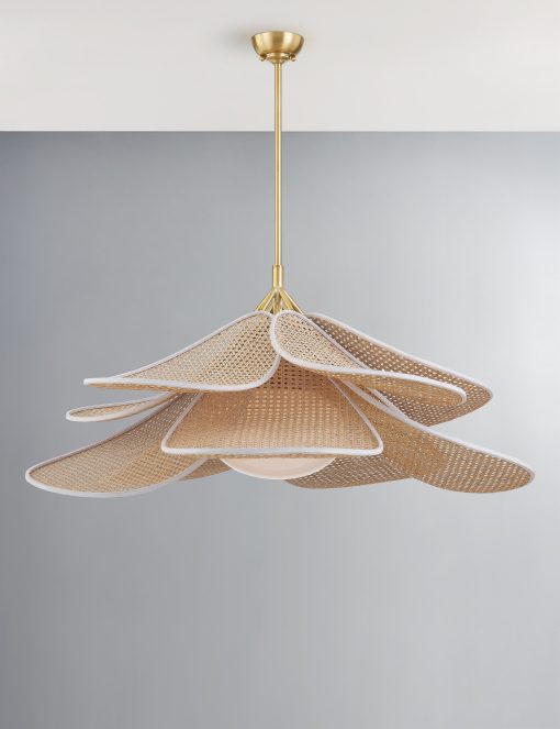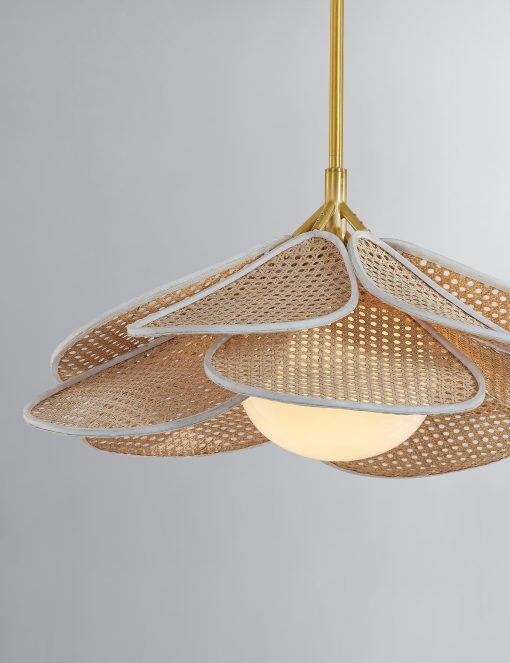 Create a sense of whimsy and texture overhead with this eye-catching pendant. The opal glass globe is layered in petal-like shades fashioned from rattan and trimmed in cottonâoffering a floral-inspired pendant light perfect for a bright and airy space.