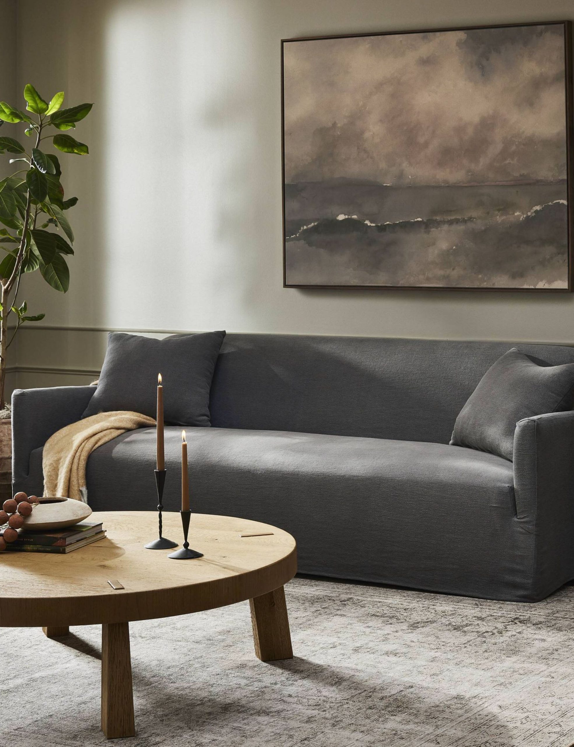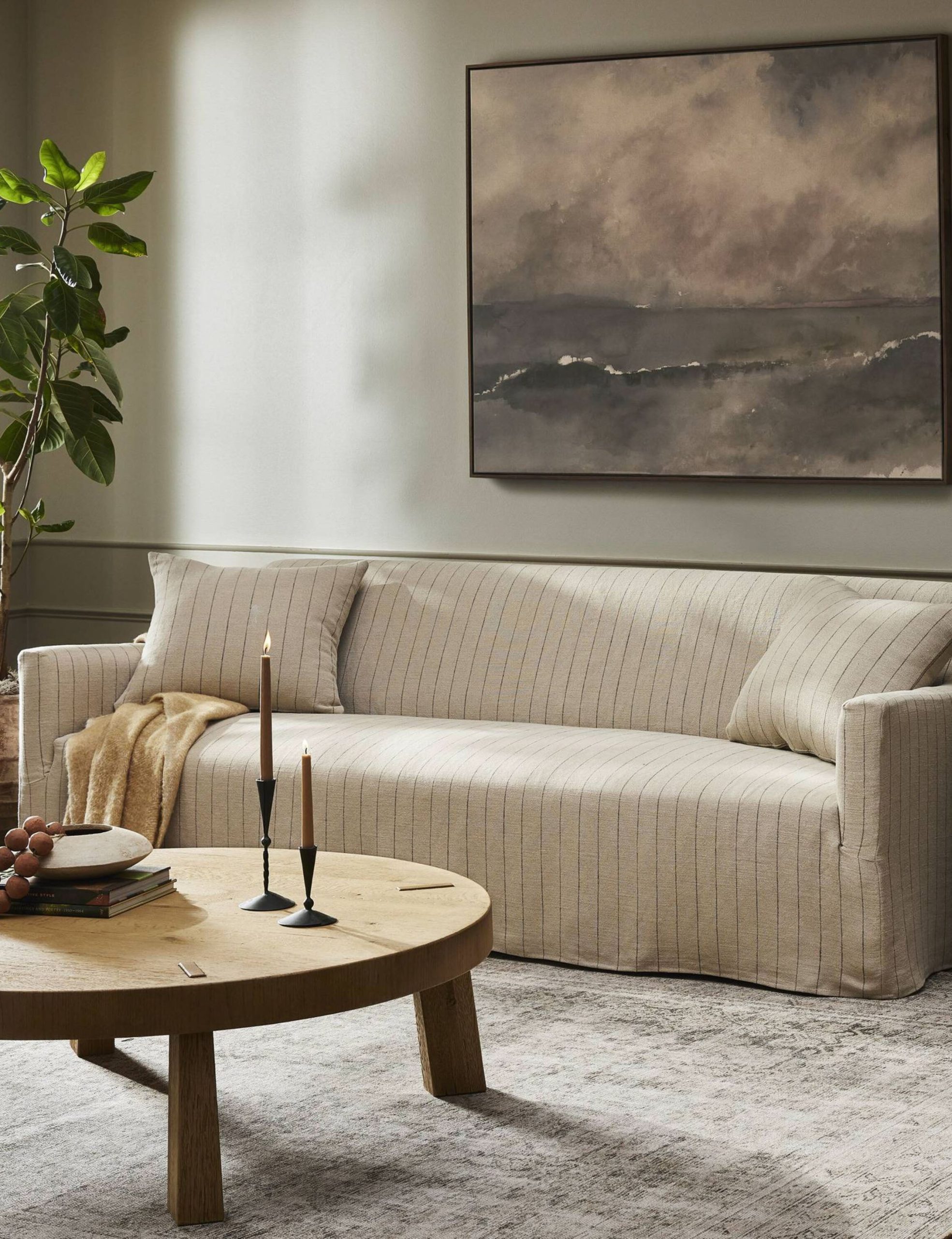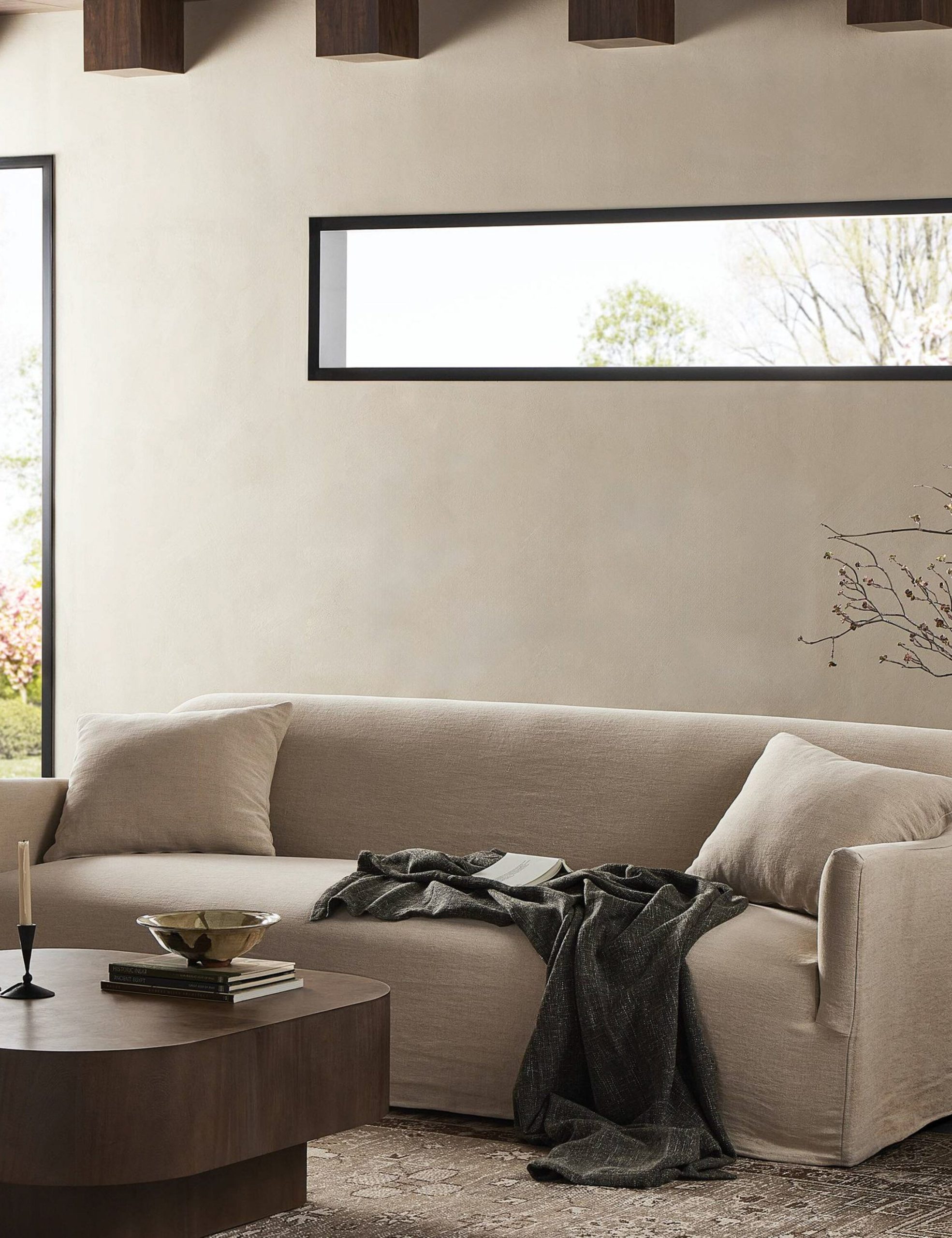 Four Hands brings their exceptional craftsmanship to a timeless collection rooted in Amber Lewis’ perennial California style. The timeless softness of a slipcovered design infuses inviting appeal to this modern sofa. It features slim track arms, plush cushionsm and accent pillows, creating a couch perfect for conversation and relaxation.