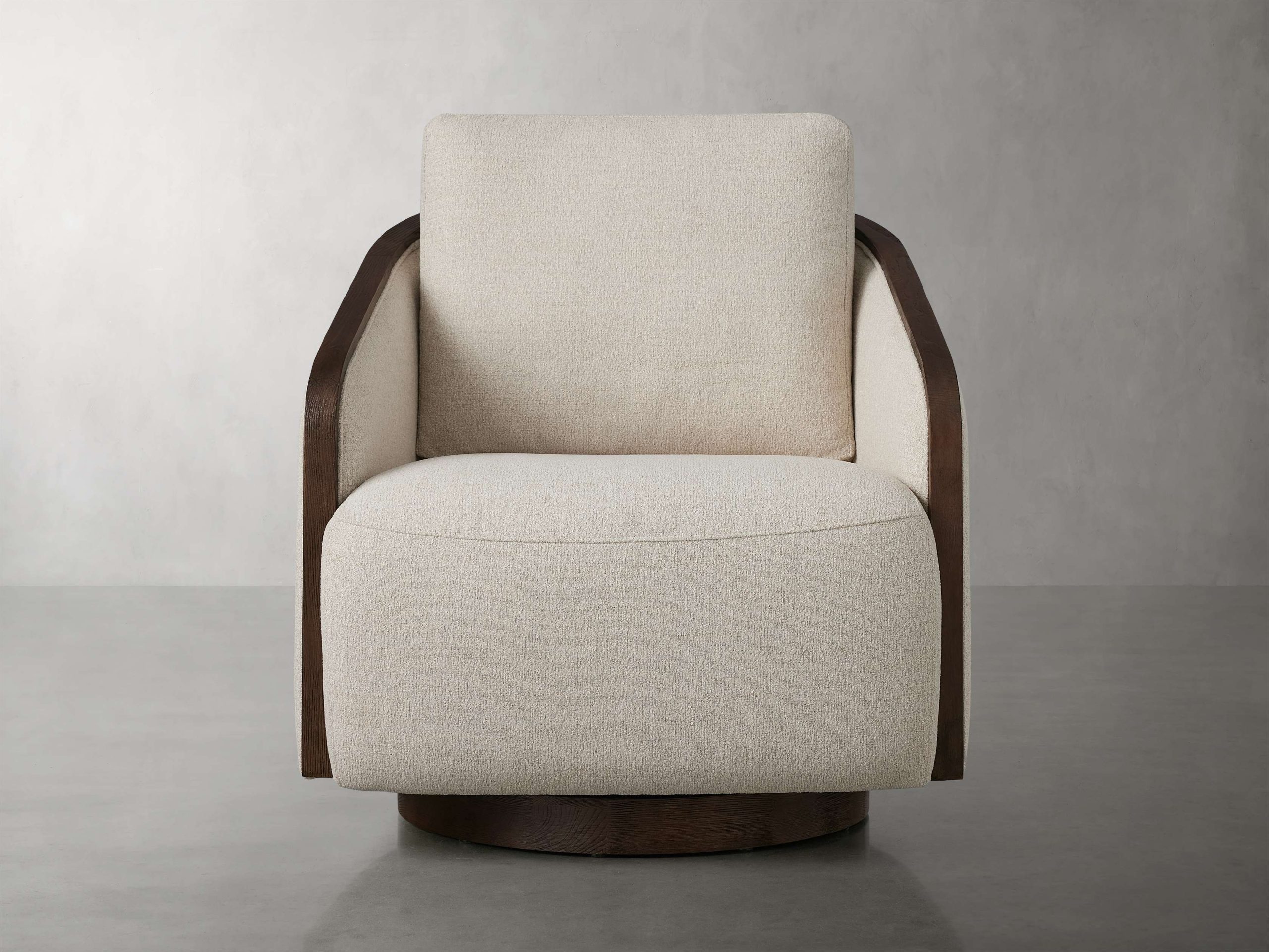 - Exposed oak edges on the arms and swivel base complement the neutral, soft tones of the cushions.
