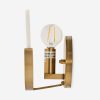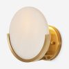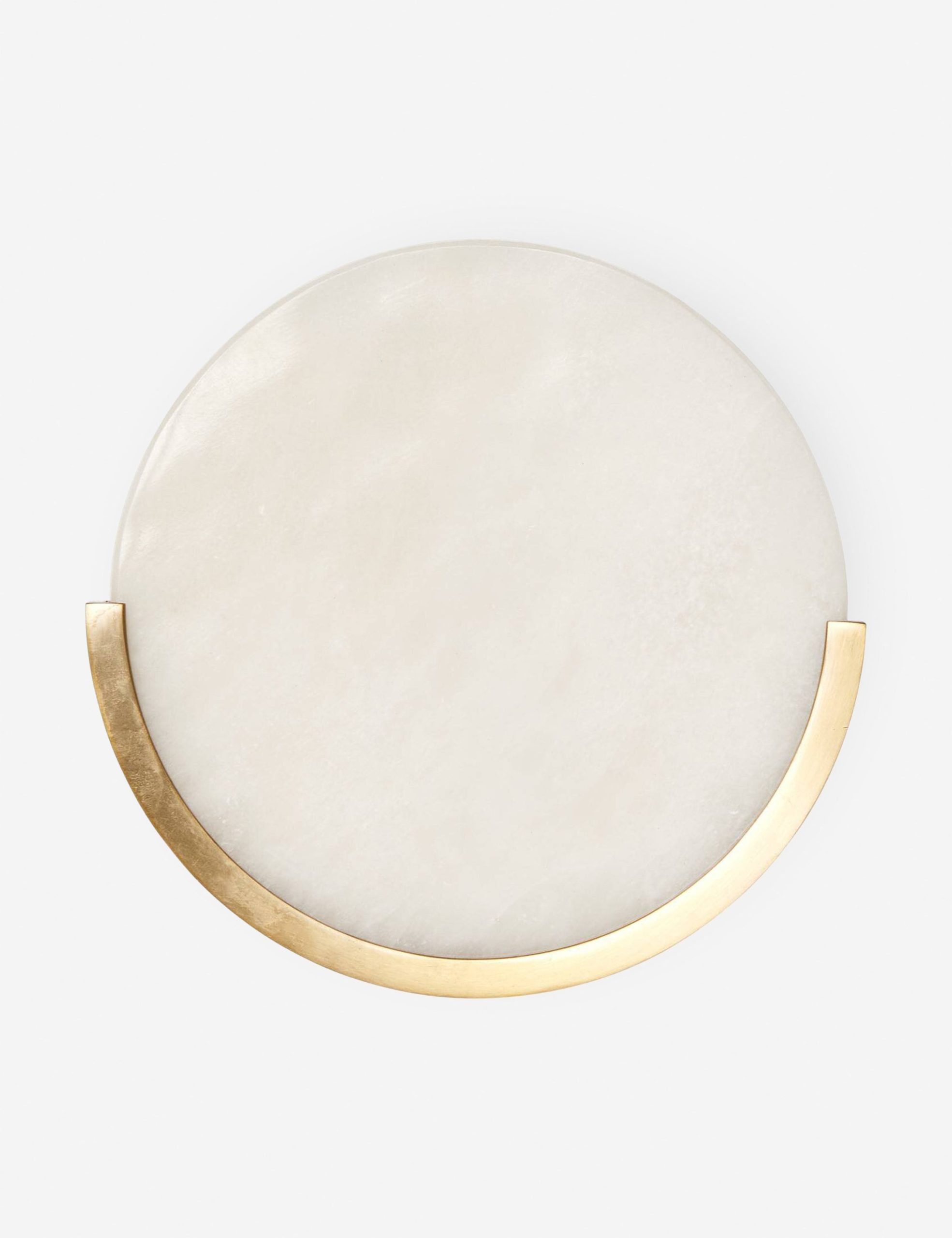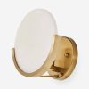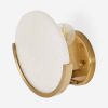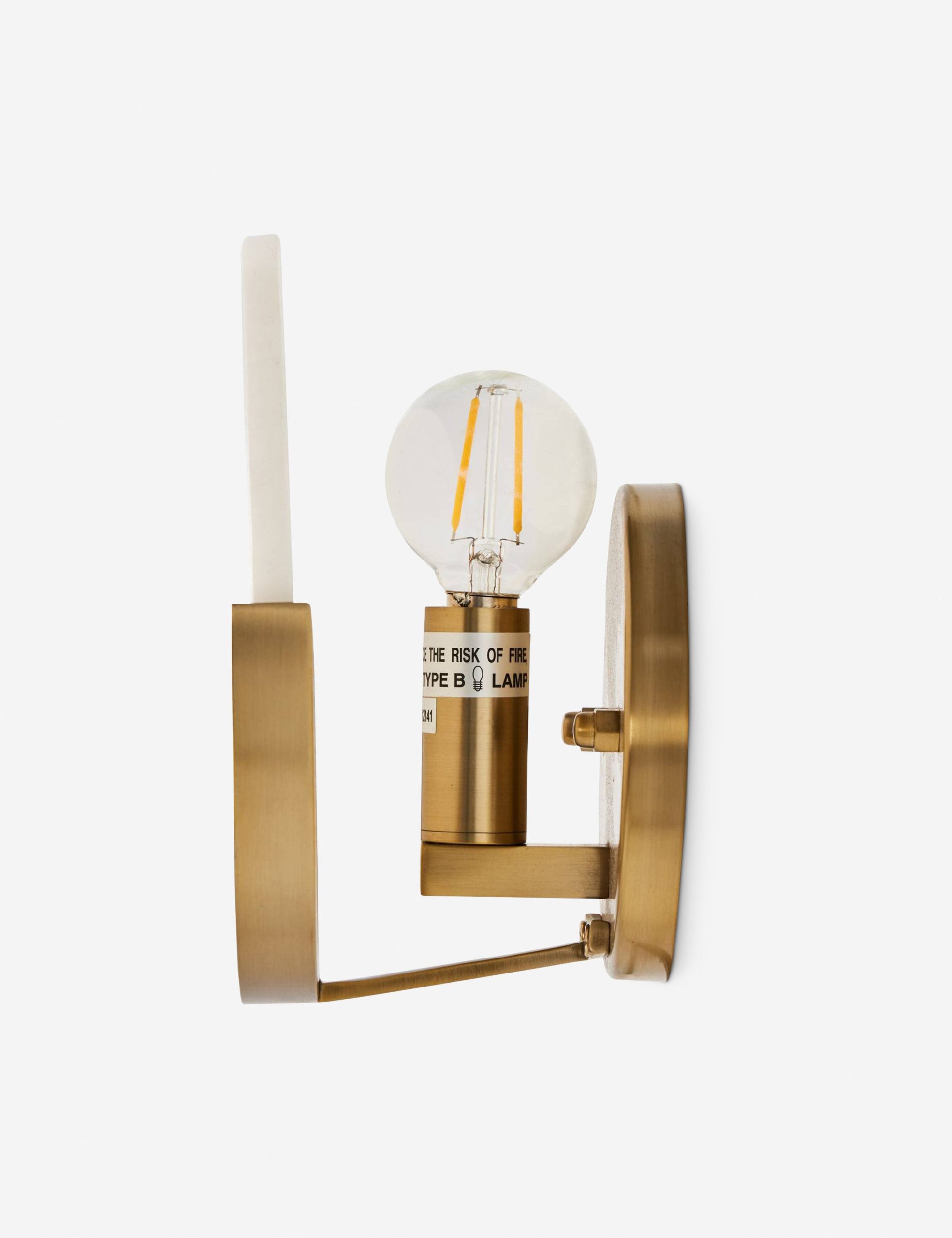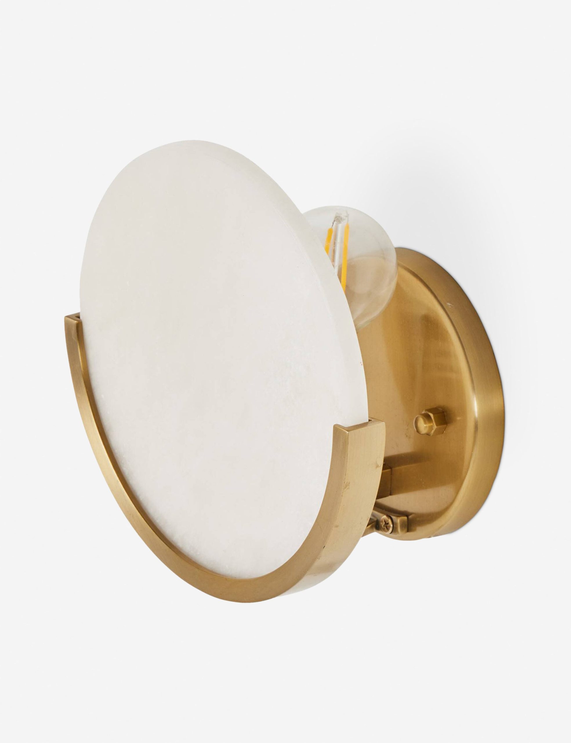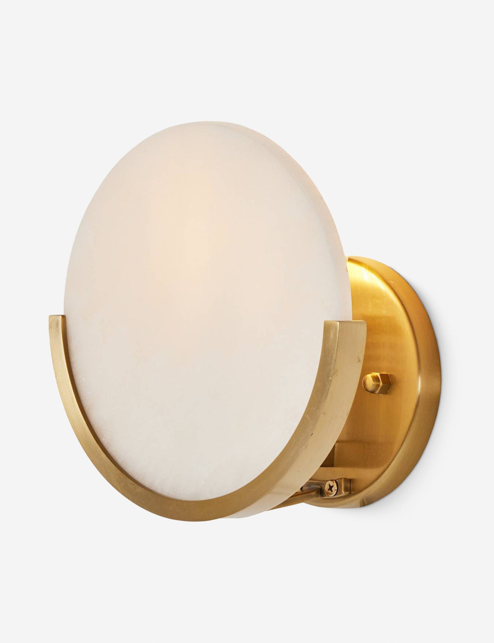 Evoking the soft light of the moon, this alabaster sconce is a sculptural art piece that doubles as lighting. A prominent cradle adds warmth and definition with a brushed brass finish, holding the alabaster disk that defines this luxurious wall sconce. Stunning in a refined entryway or offering ambient illumination in your bedroom or lounge.