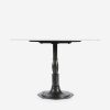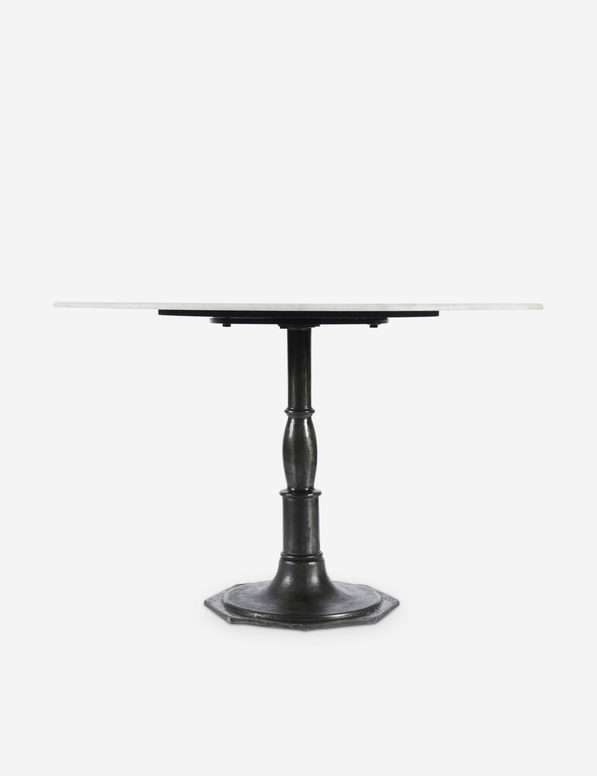 Combining modern materials and traditional design elements, this round dining table is perfect for transitional styles. Featuring a turned iron pedestal base and a sleek white marble top, this piece gives off a cute French-inspired bistro look with industrialist leanings.