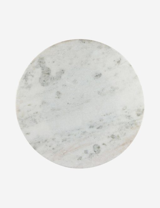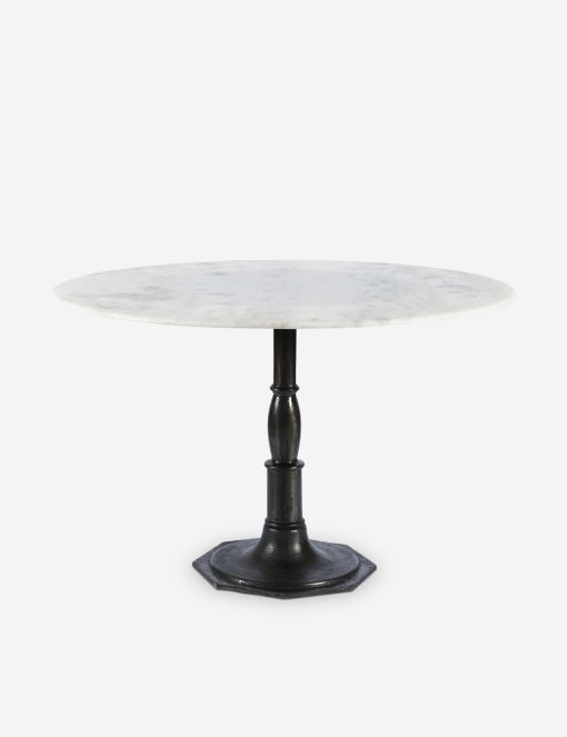 Combining modern materials and traditional design elements, this round dining table is perfect for transitional styles. Featuring a turned iron pedestal base and a sleek white marble top, this piece gives off a cute French-inspired bistro look with industrialist leanings.