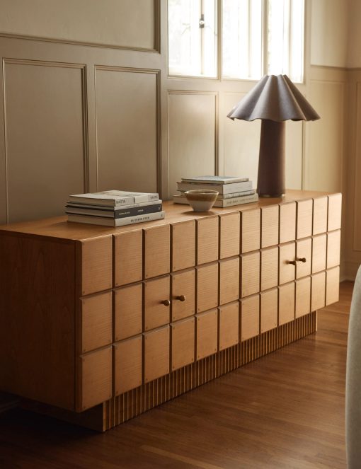 The Lee sideboard offers visual intrigue and natural grain warmth with its blockwork detailing and fluted plinth base. The name is a nod to Sarah’s dad, who fabricated the custom doors on which the cabinet doors are based. This sideboard cabinet is from our exclusive Sarah Sherman Samuel collaboration and features all the trademarks of her warm, edited style.