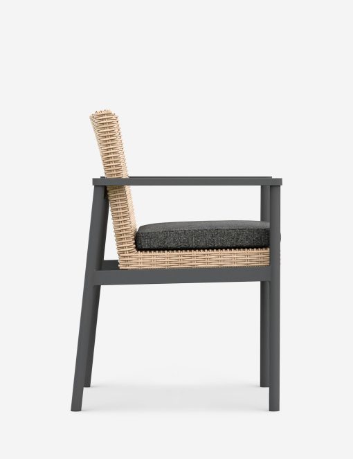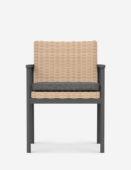 The Walsh dining chair brings mid-century charm with a laid-back poise. The all-weather wicker seat sits in a clean aluminum frame for a streamlined look with a touch of texture. We love the versatility of these dining arm chairs for a modern tone in an outdoor lounge or open-air design.