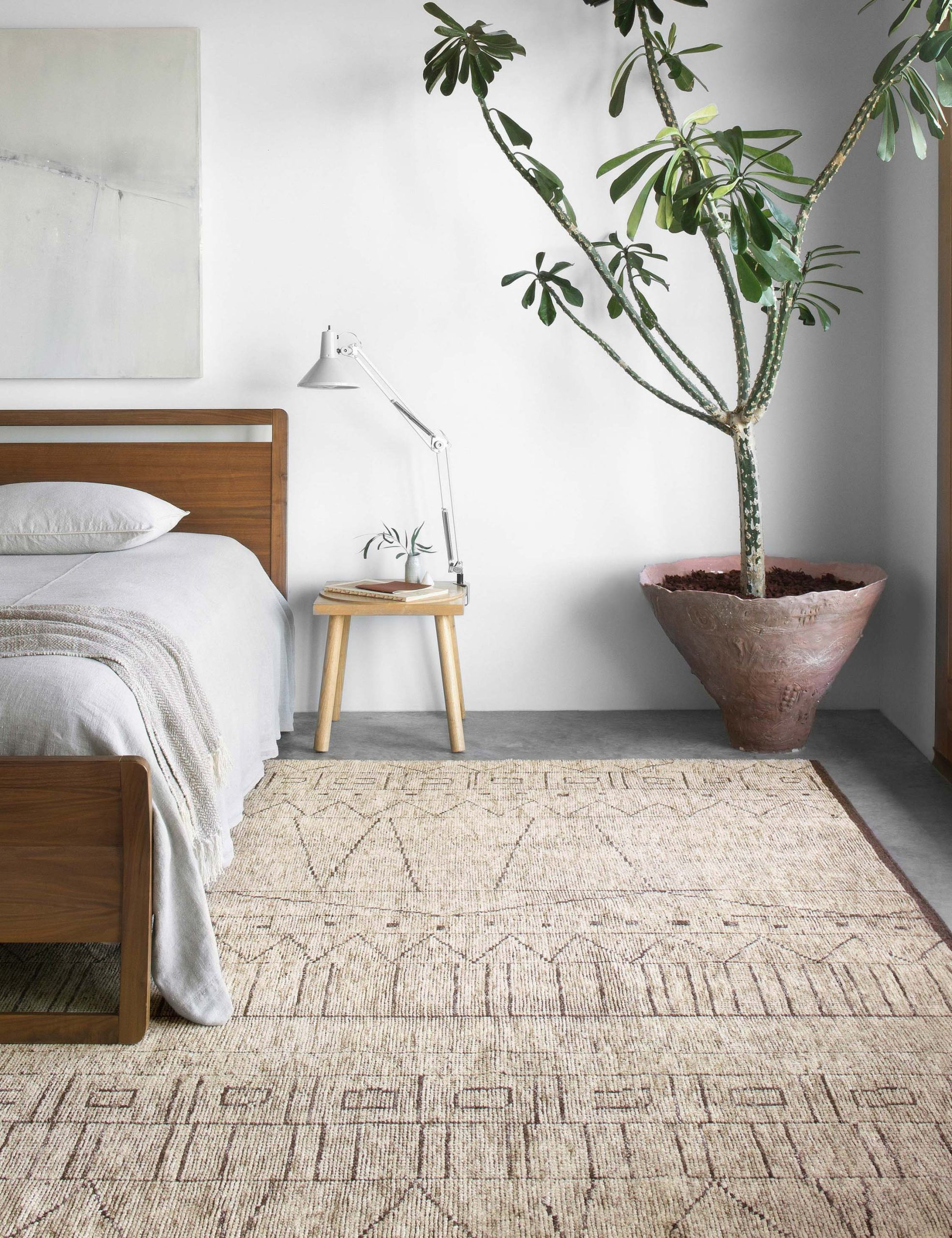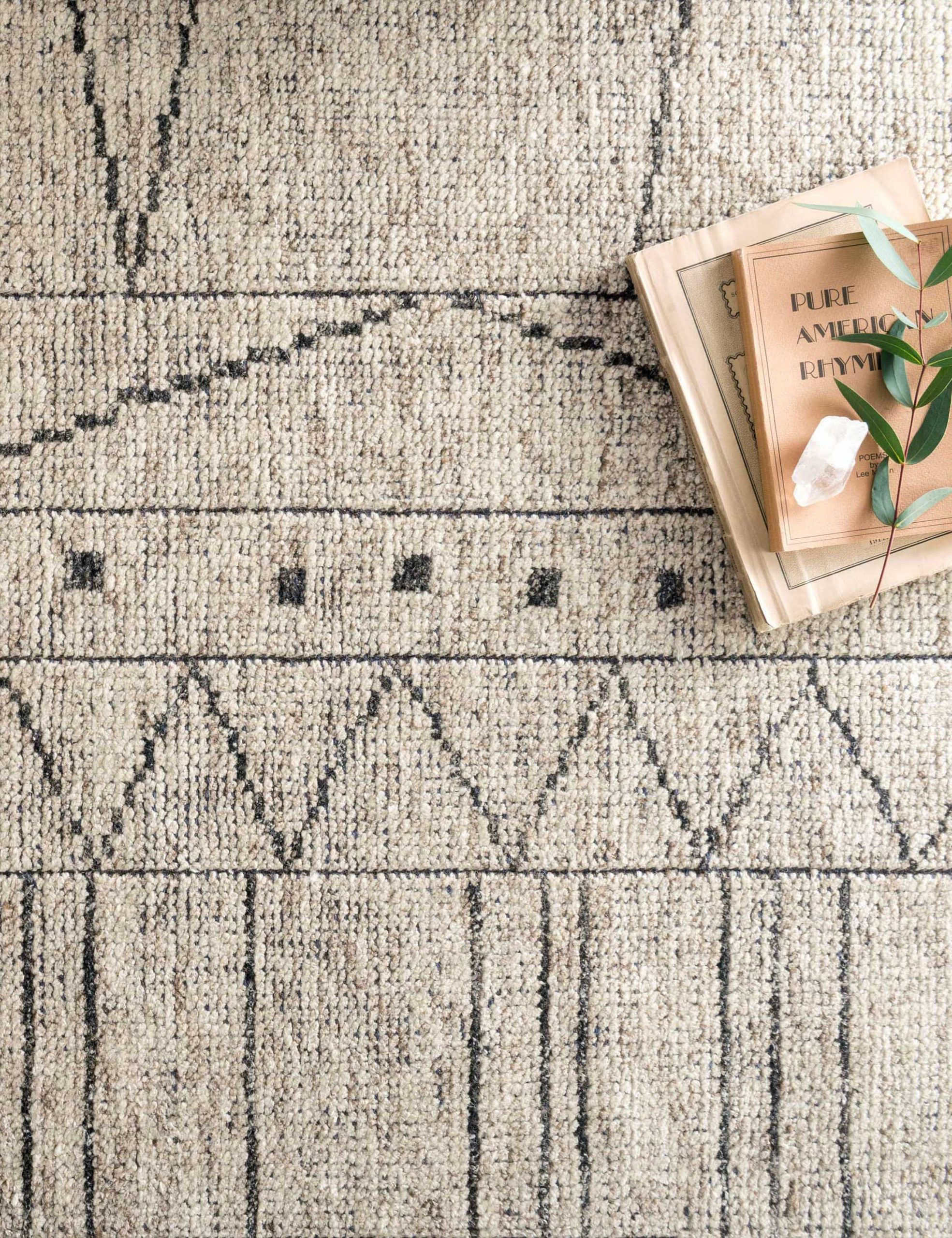 Soft, earthy colors enrich intricate geometric patterns in this modern hand-knotted rug with a resilient woolen blend construction. Designed to last and crafted by master artisans with attention to every hand-tied knot, this rug offers an elevated feel with its eye-catching pattern of linear elements. A grounding touch in your home office or an inviting living room curation.