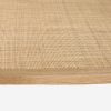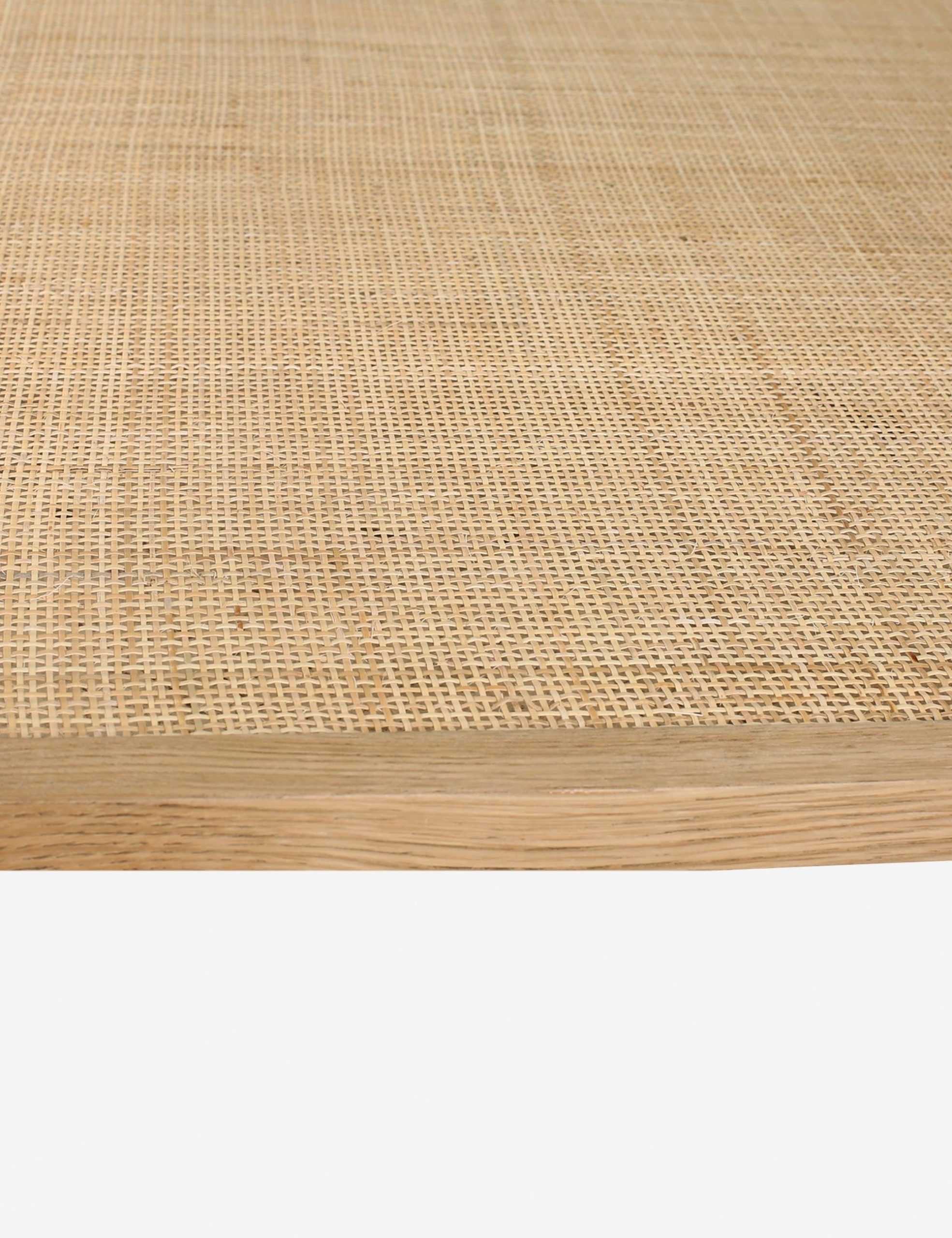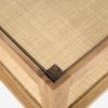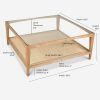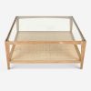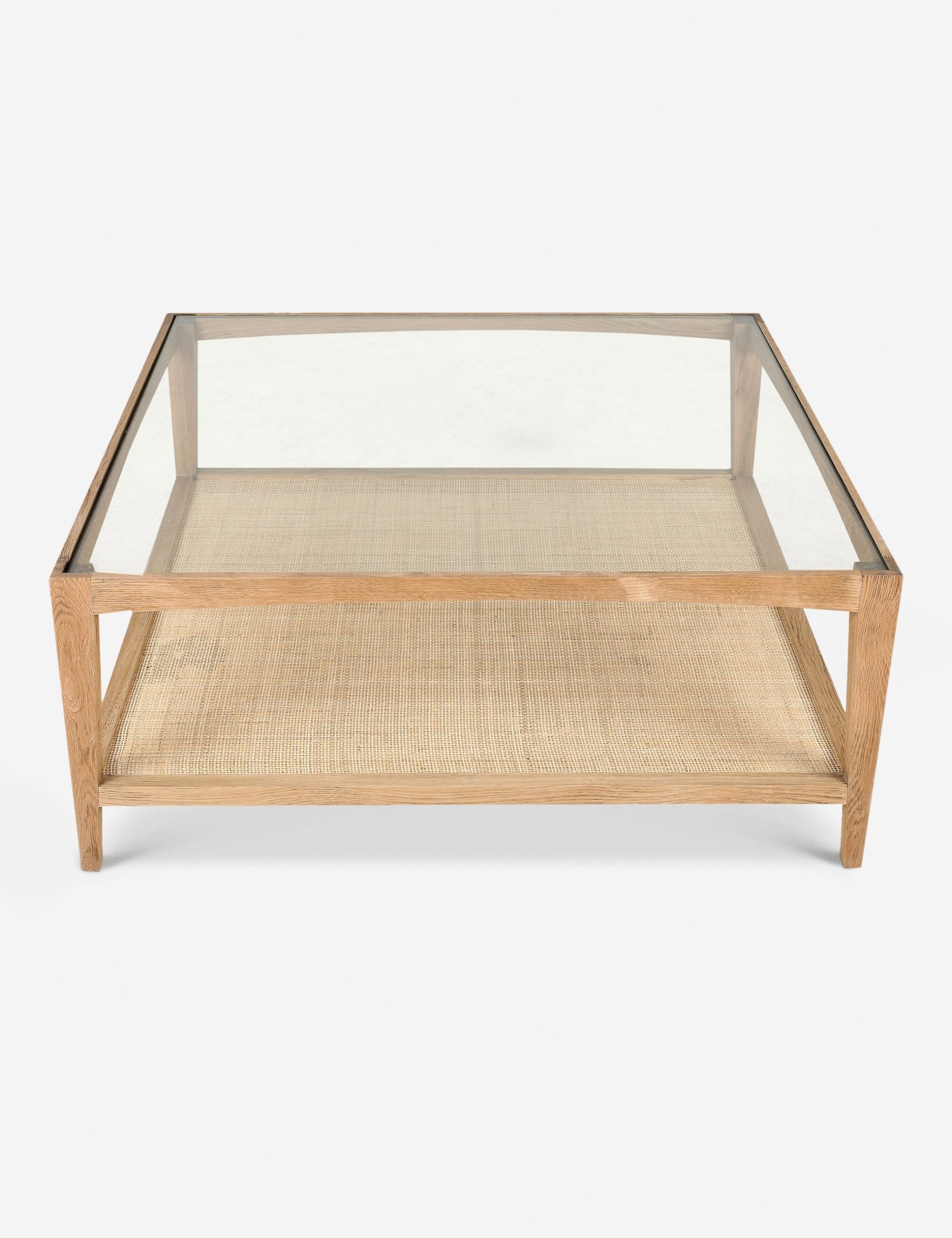 A timeless square coffee table made with a solid oak frame, natural cane shelf, and tempered glass top that offers a warm, modern tone to a living room. This versatile coffee table is just as suited to a few thoughtfully chosen pieces of refined décor as it is to a casual array of drinks and coffee table books.