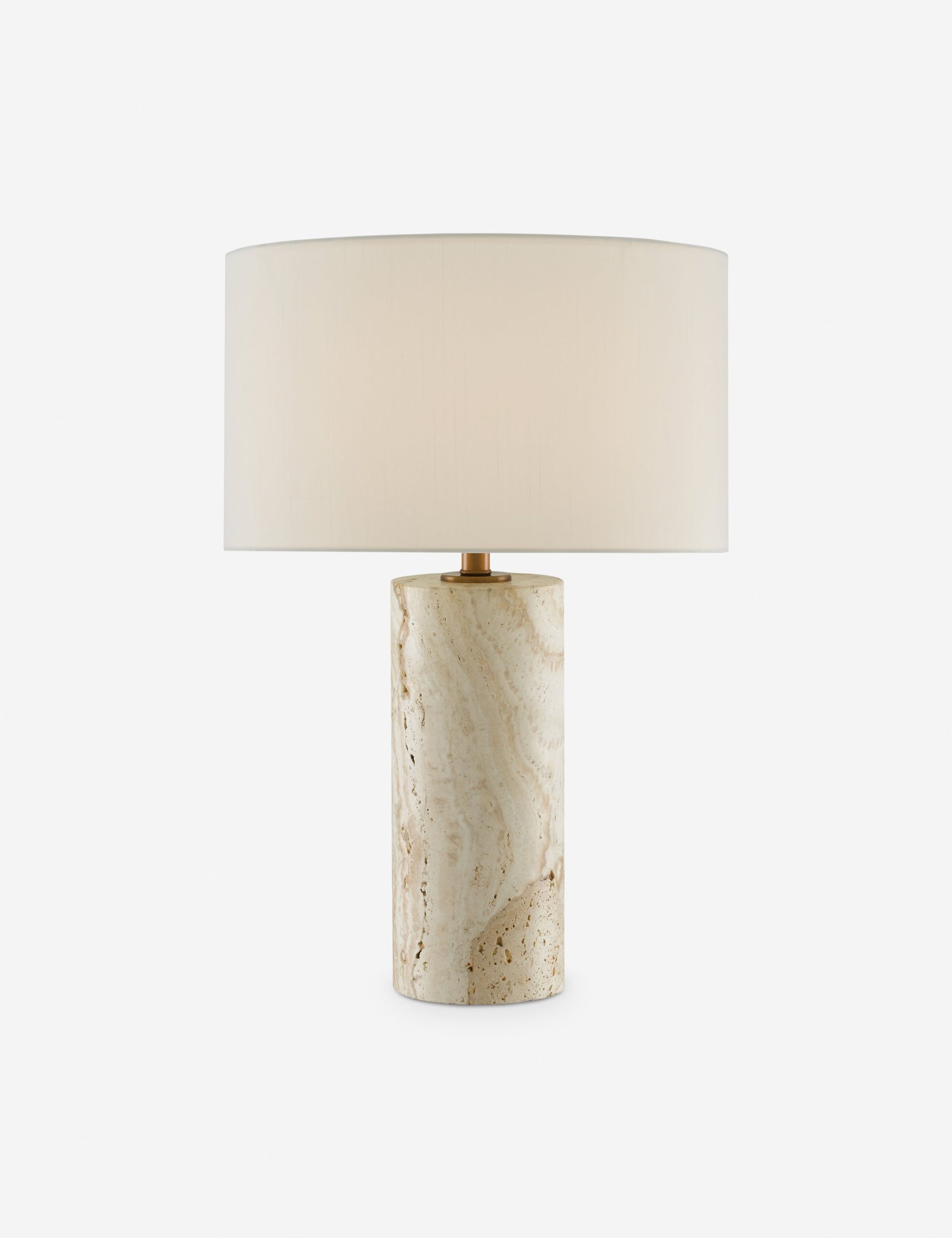 A column of marble brings an architectural elegance to the Evora table lamp. The unique veining and texture of the stone make each lamp a signature statement piece. Antique brass hardware and a shantung shade complete the look for an elevating touch of tabletop light.