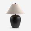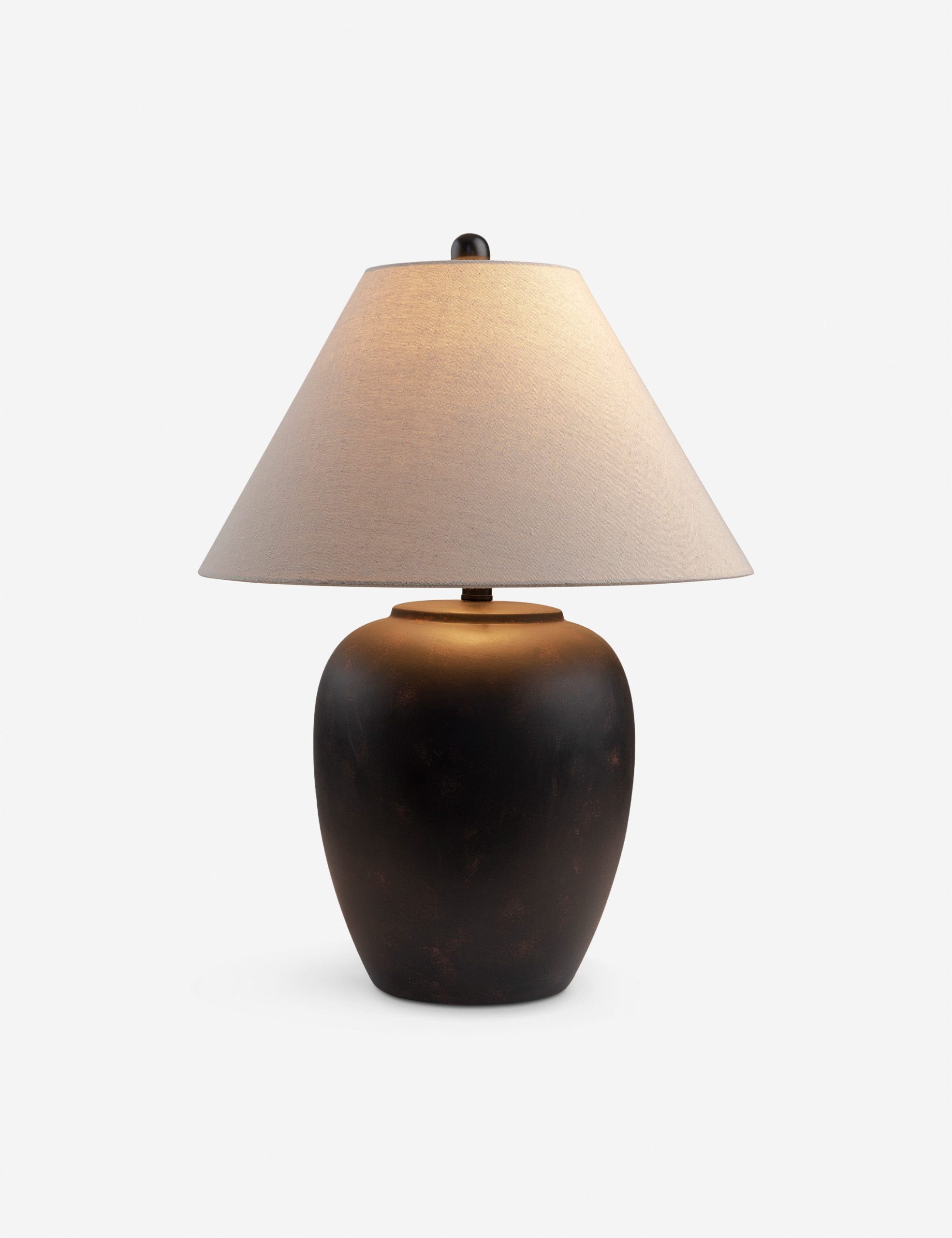 Simply stunningâthe Kimora table lamp brings a timeless look to any tabletop. Its sleek vessel shape is topped with a beige linen shade that filters a warm pool of light. This lamp’s black finish and matching finial offer a versatile fit with standout appeal for transitional decor.