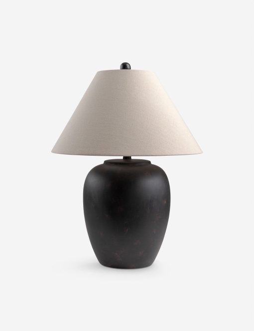 Simply stunningâthe Kimora table lamp brings a timeless look to any tabletop. Its sleek vessel shape is topped with a beige linen shade that filters a warm pool of light. This lamp’s black finish and matching finial offer a versatile fit with standout appeal for transitional decor.