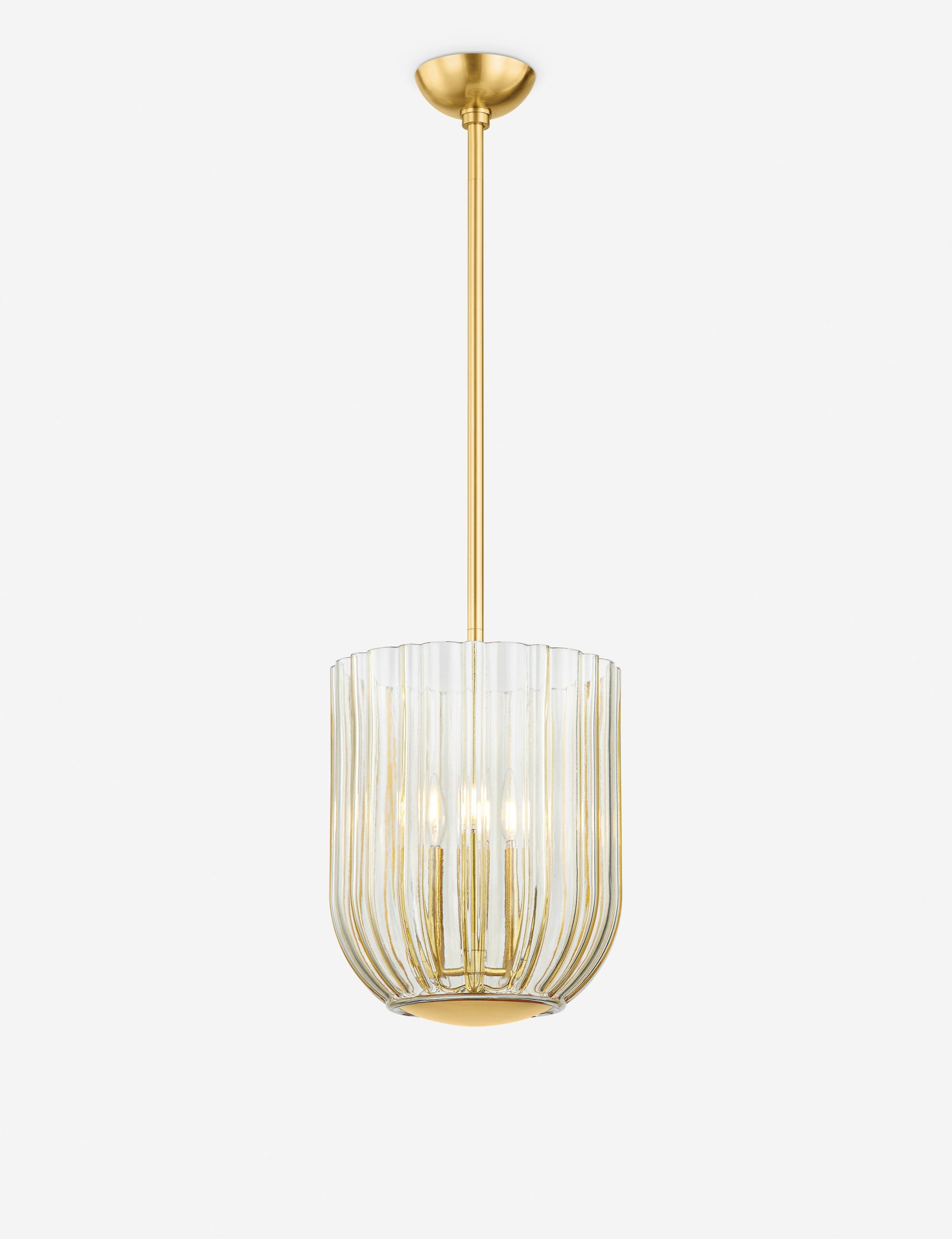 Scalloped champagne glass with an antique brass-finished stem and canopy brings a soft, floral character to the Morera pendant light. Itâs an artistic display that fills your living space with ambient light. Simply impeccable, this pendant is a stunning addition to sophisticated spaces.