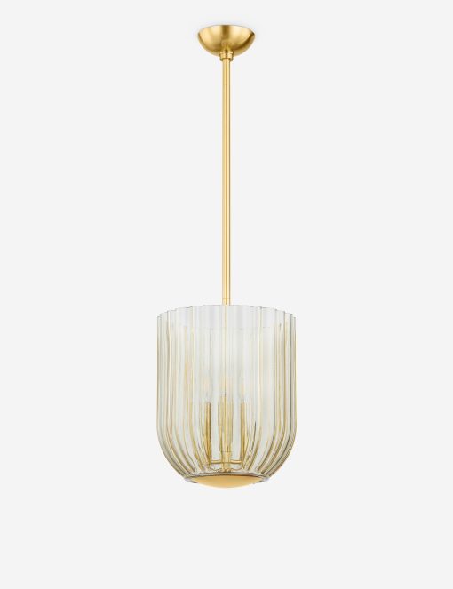 Scalloped champagne glass with an antique brass-finished stem and canopy brings a soft, floral character to the Morera pendant light. Itâs an artistic display that fills your living space with ambient light. Simply impeccable, this pendant is a stunning addition to sophisticated spaces.