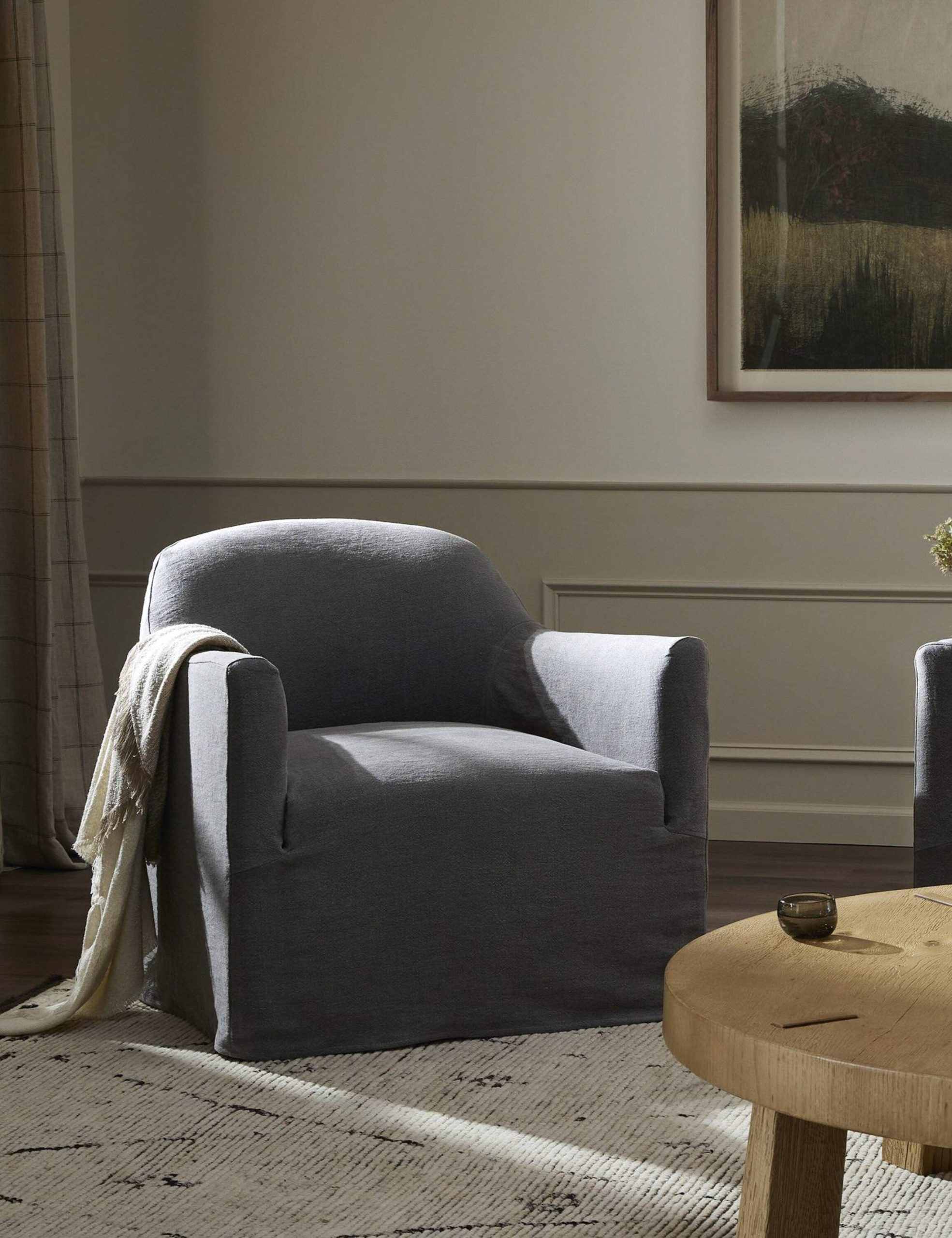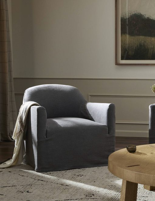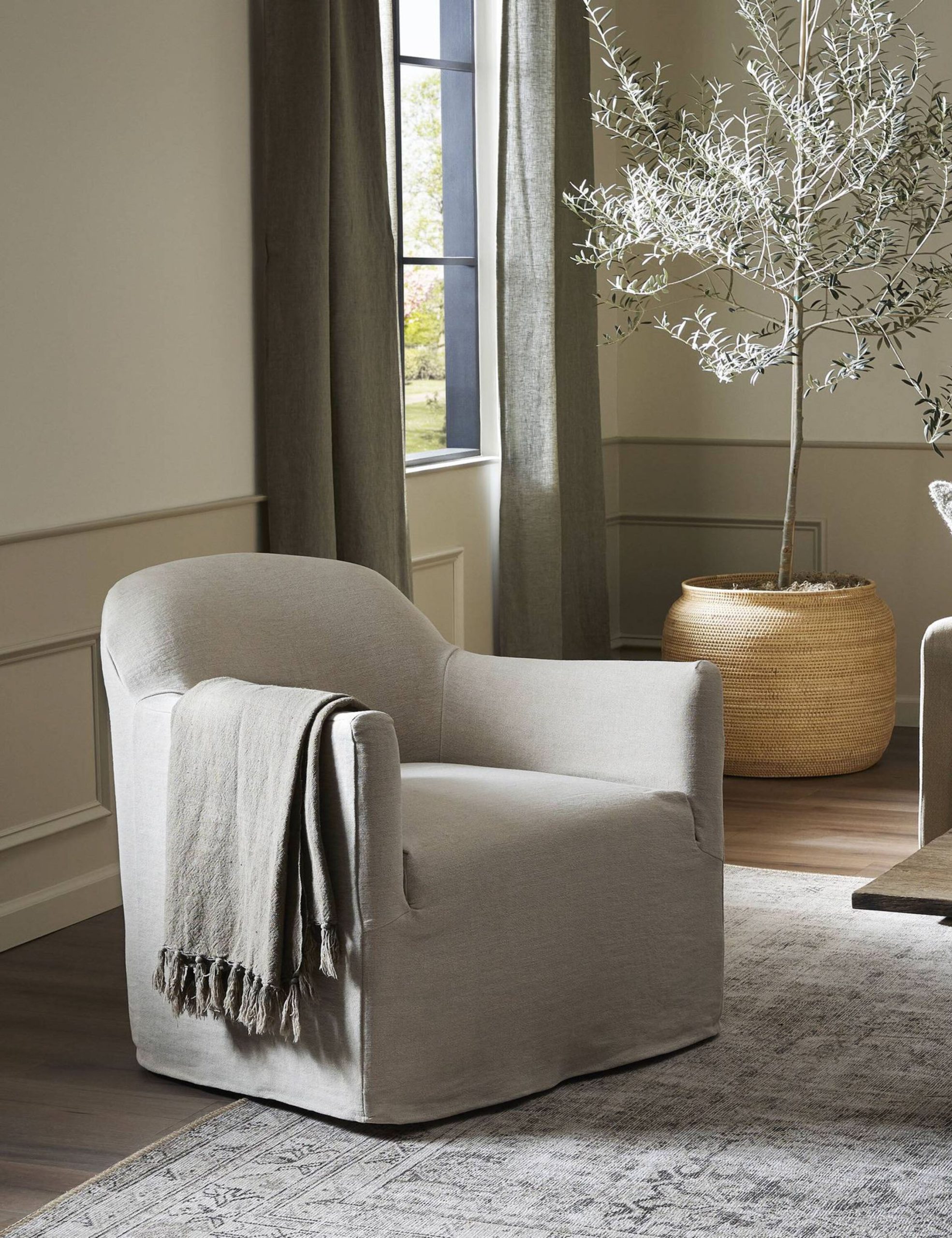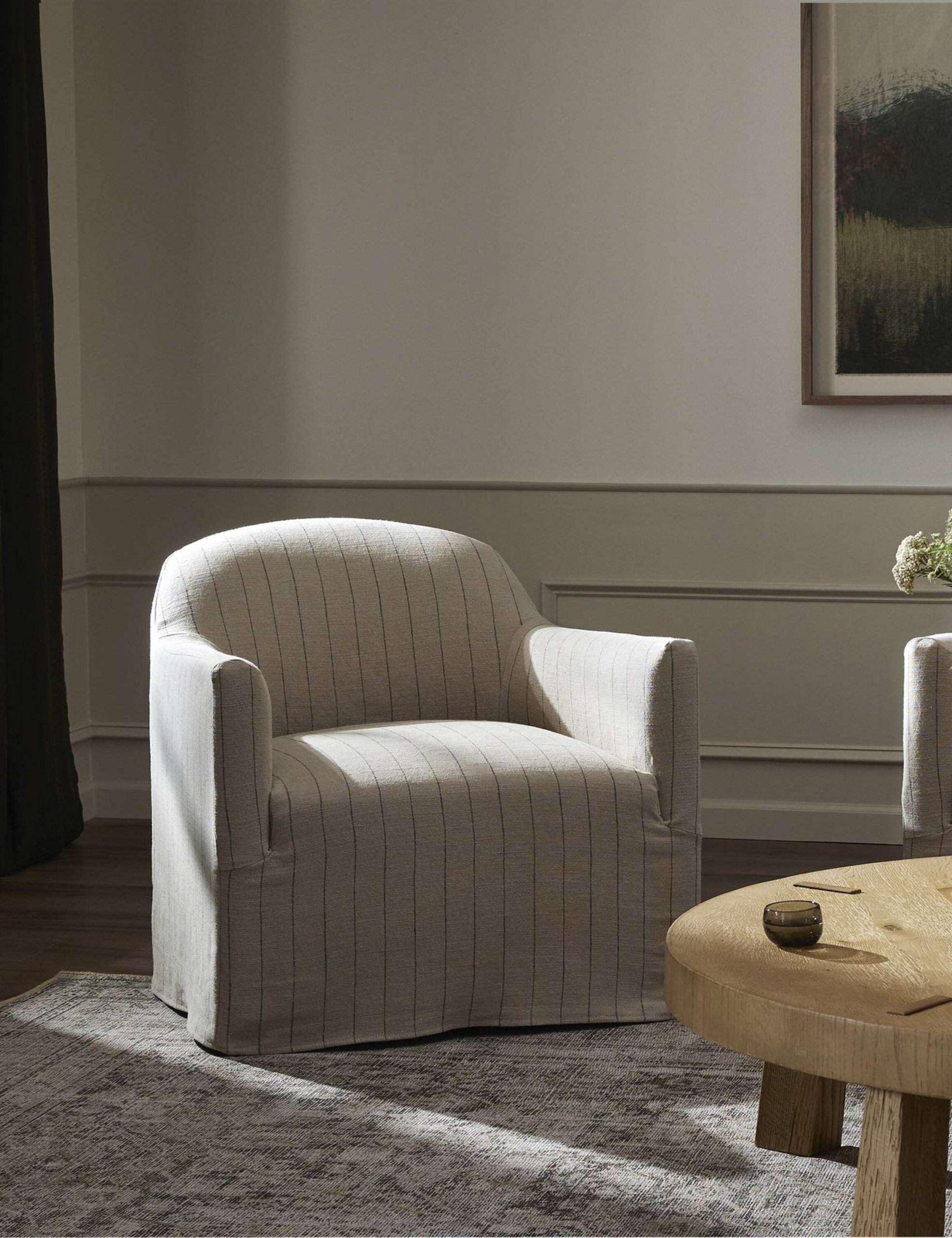 Four Hands brings their exceptional craftsmanship to a timeless collection rooted in Amber Lewis’ perennial California style. The timeless softness of a slipcovered design infuses inviting appeal on a modern accent chair. Featuring a swivel design, this occasional chair is perfect for conversation and relaxation.