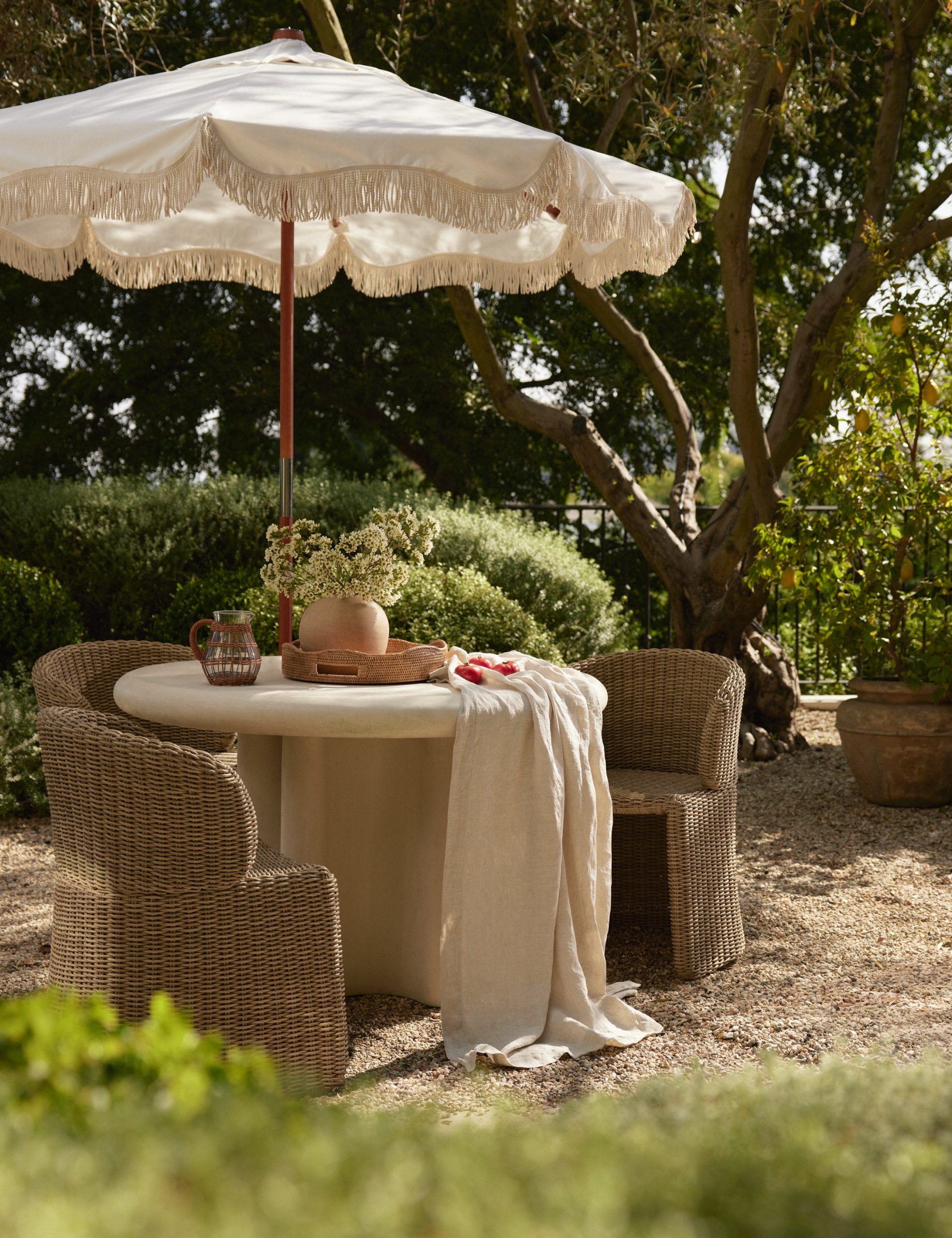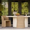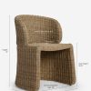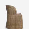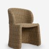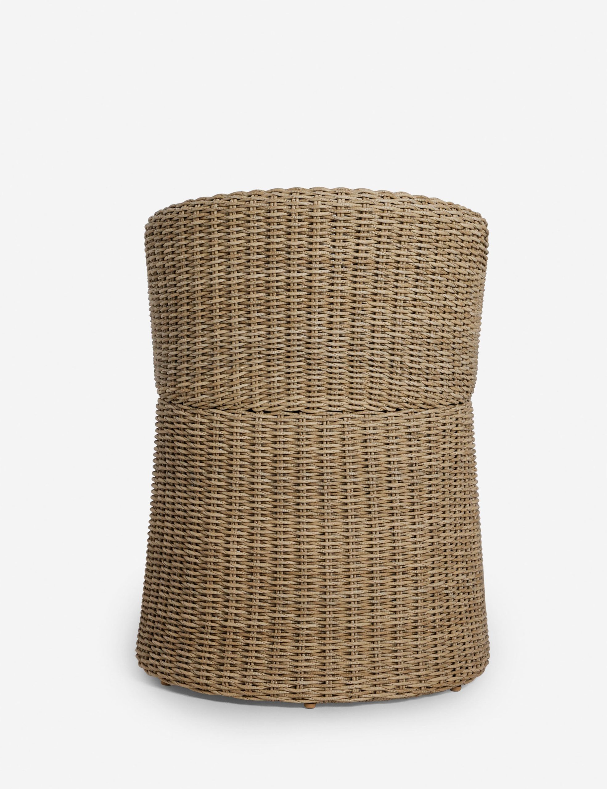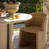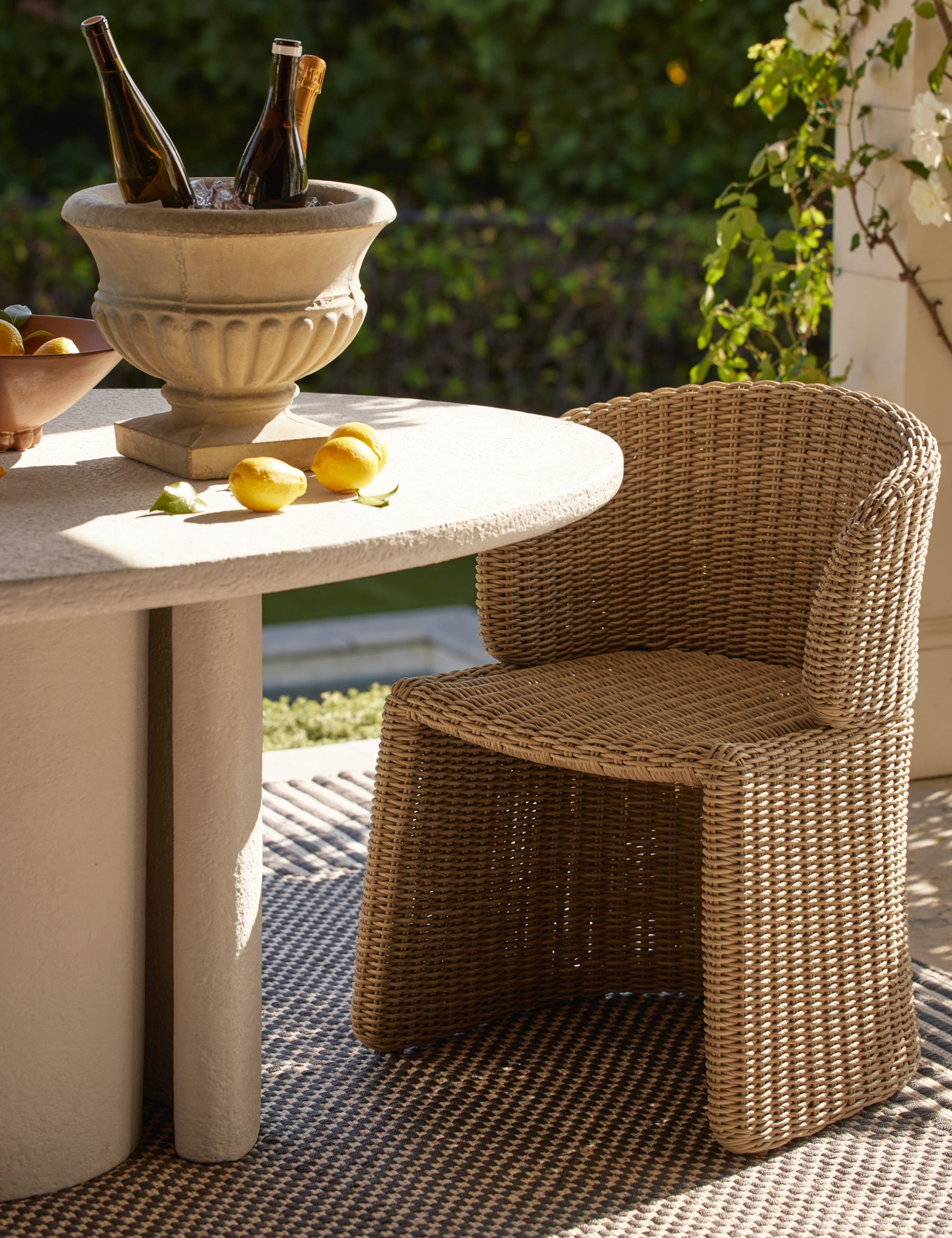 The Mettam dining chair brings a modern edge to wicker seating. A sturdy iron frame forms a sculptural silhouette clad allover in all-weather wicker for lasting style outdoors. The barrel back of this dining seat offers comfort with a stylish edge that can elevate both casual and artfully refined settings.