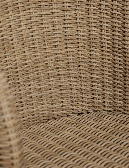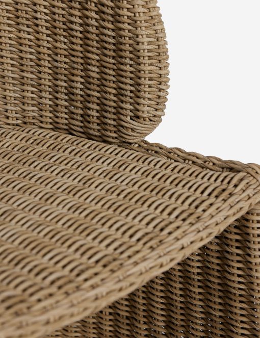 The Mettam dining chair brings a modern edge to wicker seating. A sturdy iron frame forms a sculptural silhouette clad allover in all-weather wicker for lasting style outdoors. The barrel back of this dining seat offers comfort with a stylish edge that can elevate both casual and artfully refined settings.