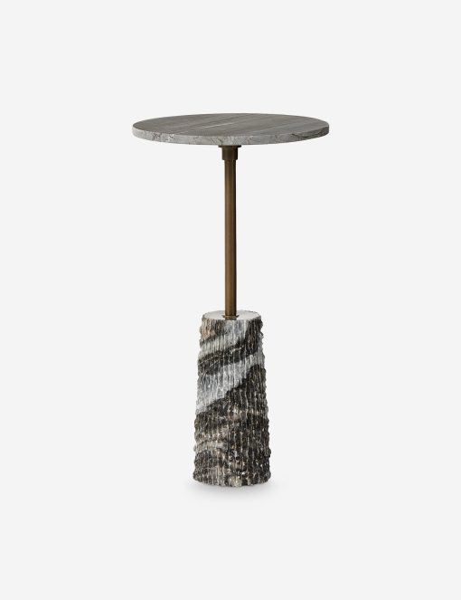 Bring a textural moment to your design with the Fallow side table. The rough marble base is channel-grooved, creating a sense of movement in the striated stone. We love the sleek contrast of the brass-finished stem and polished round top—the perfect end table for sumptuous seating.
