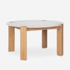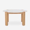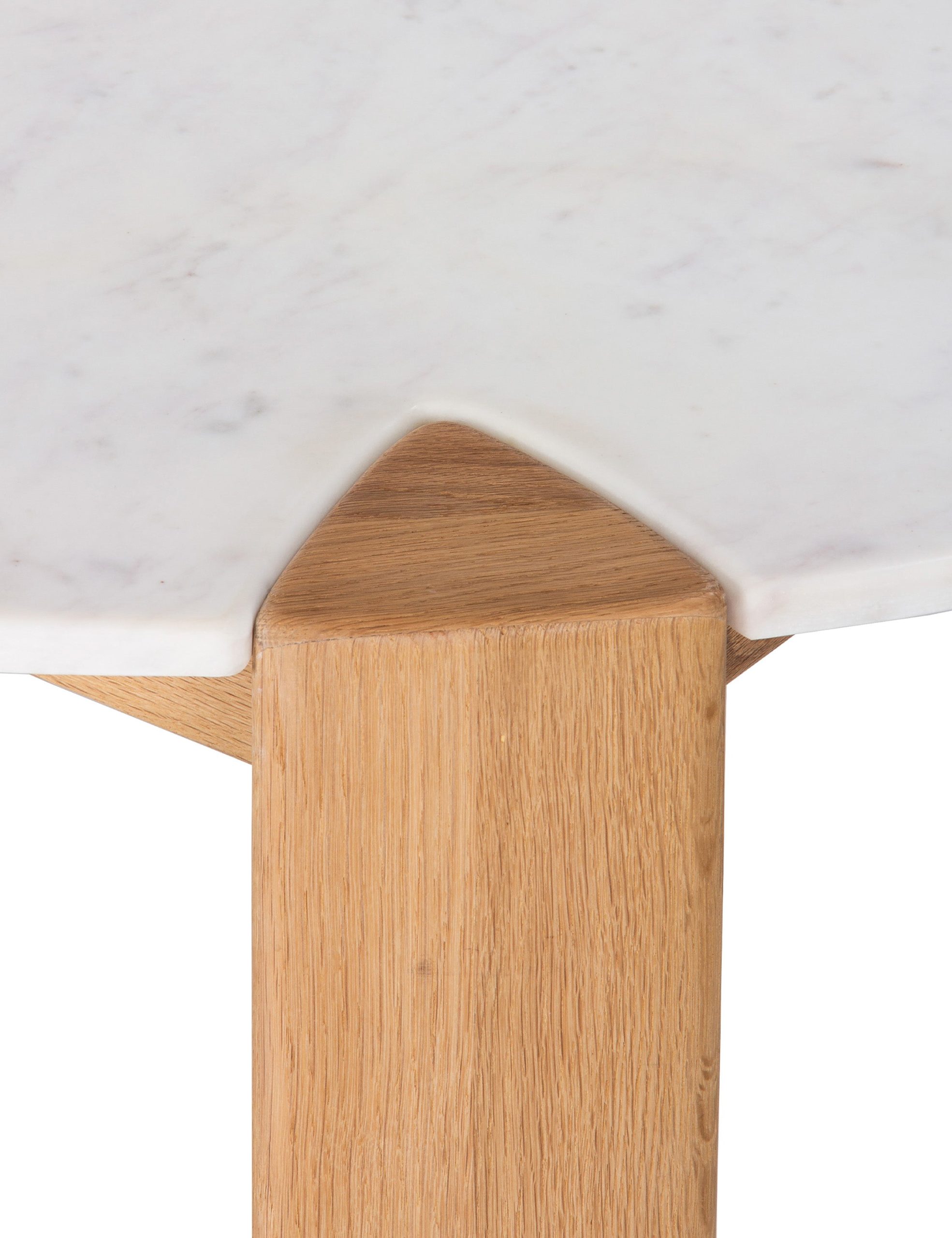 The Bayer dining table takes a note from fine cuisine鈥攕imple ingredients elevated. Its clean lines offer a pared-back look with a round Banswara marble top. Solid oak legs sit flush into triangular notches in the stone, highlighting the luxe material mix.
