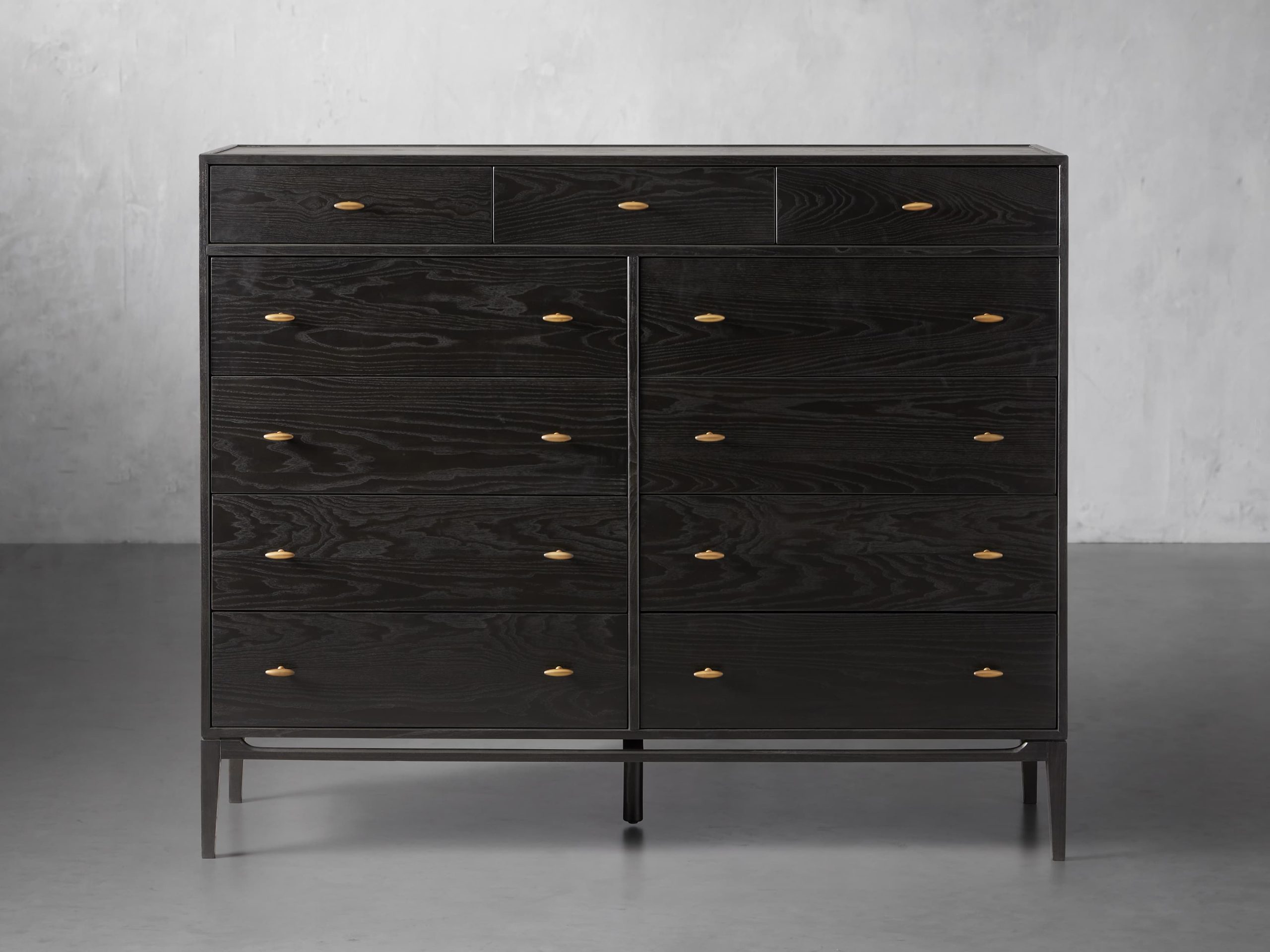 - Brass hardware features a brushed finish to complement the wood’s dark tones.