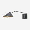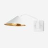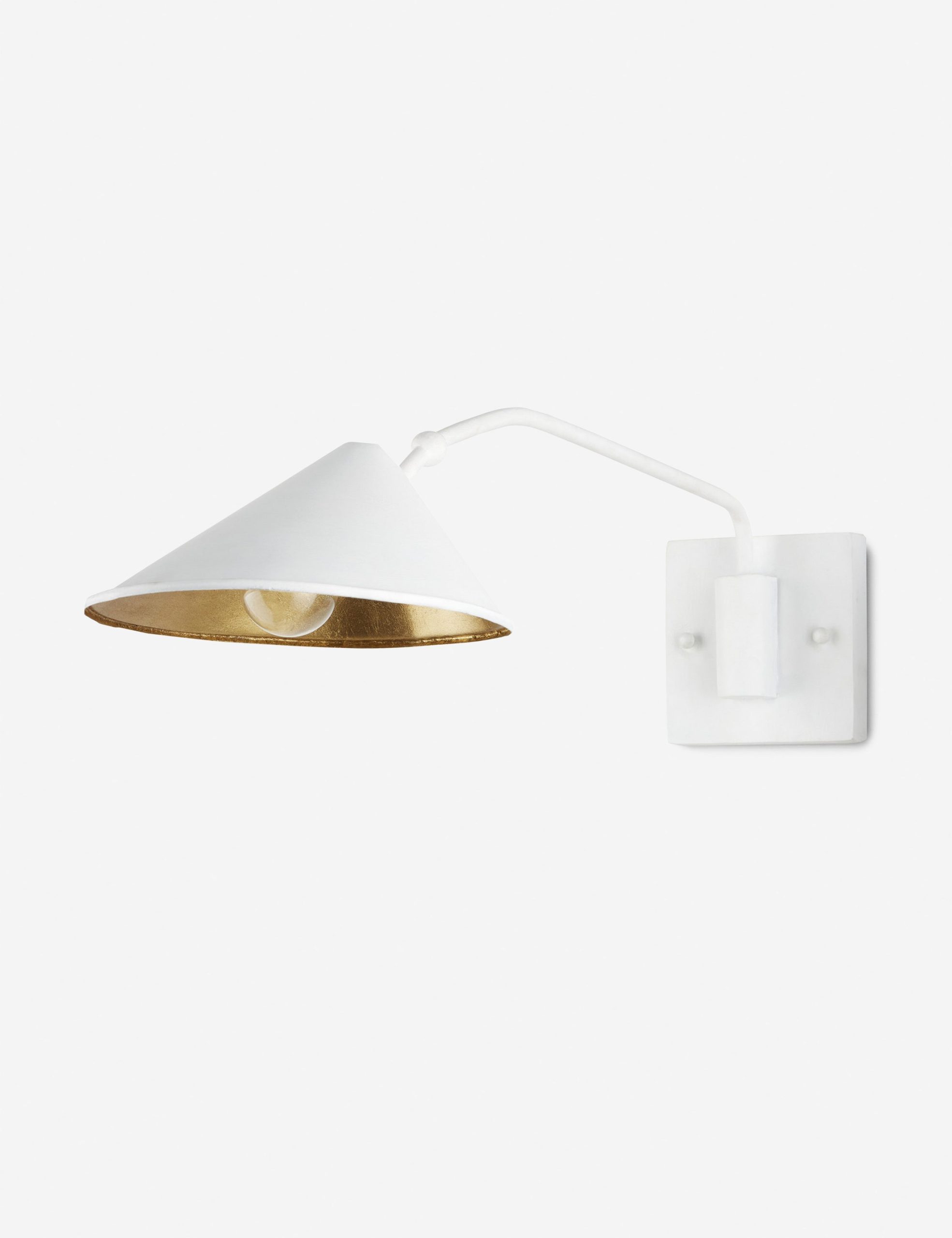 Blending industrial style with a vintage touch, the Marca sconce is a stunning choice for transitional edits. The angular design offers a striking silhouette with a gold leaf lining for warm illumination. This adjustable wall sconce is perfect for directing accent or task light in the room.