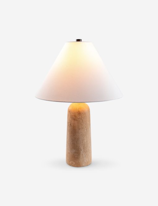 Table light with a grounding touch. This travertine lamp offers the perfect combination of natural impact and tailored elegance with its textural stone base and tapered linen shade. We love its transitional appeal for an entryway or living room console table.