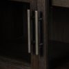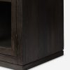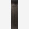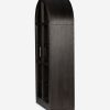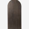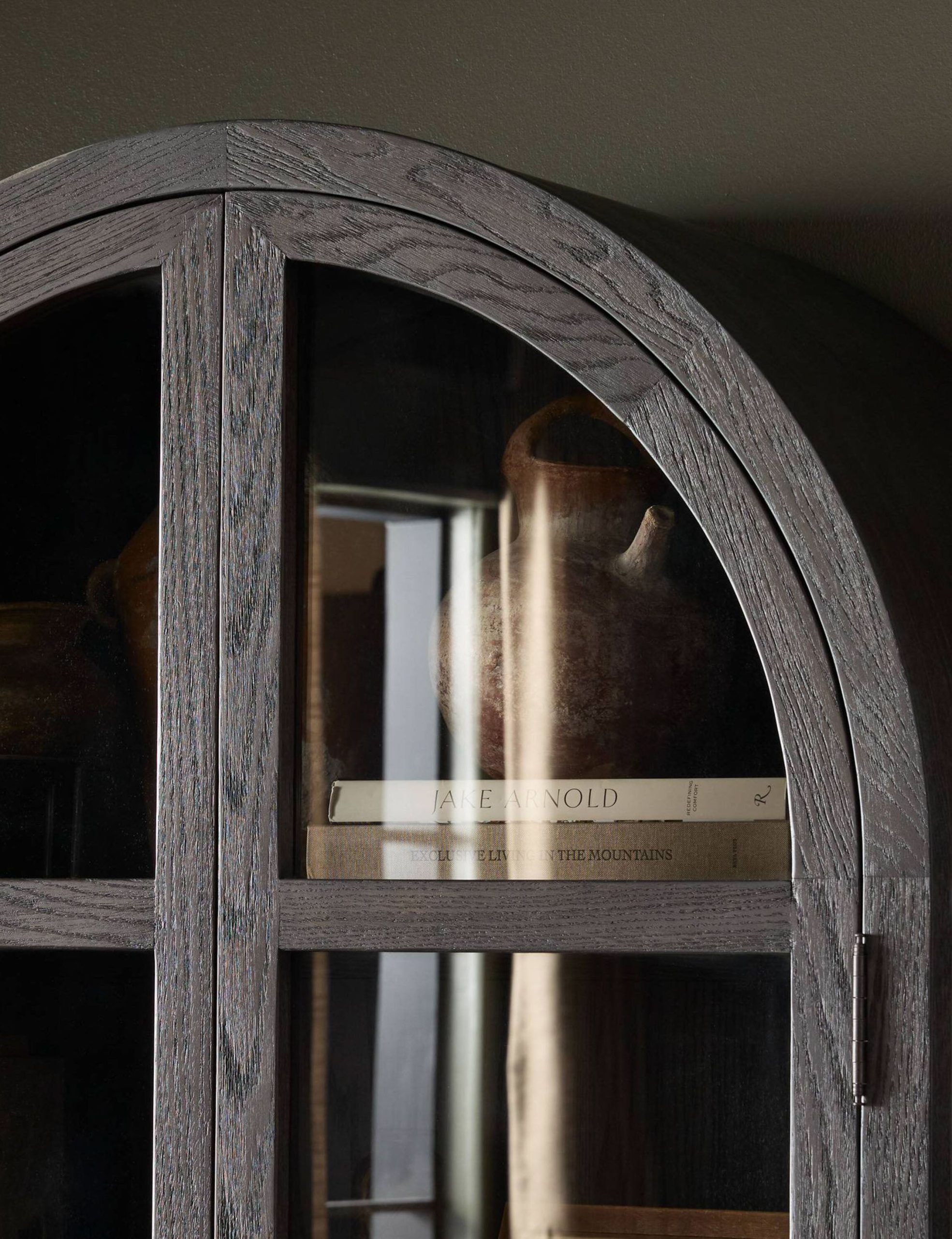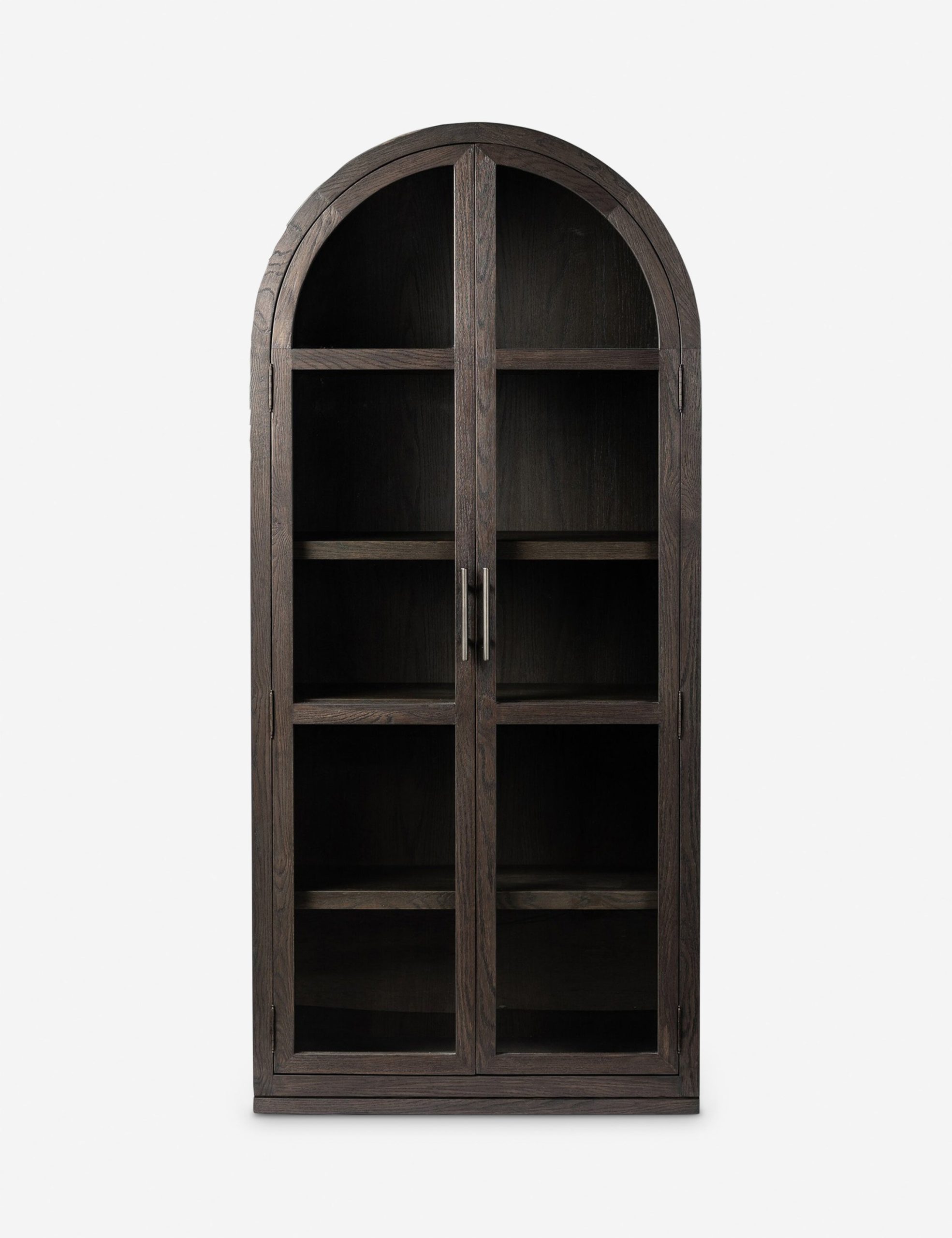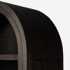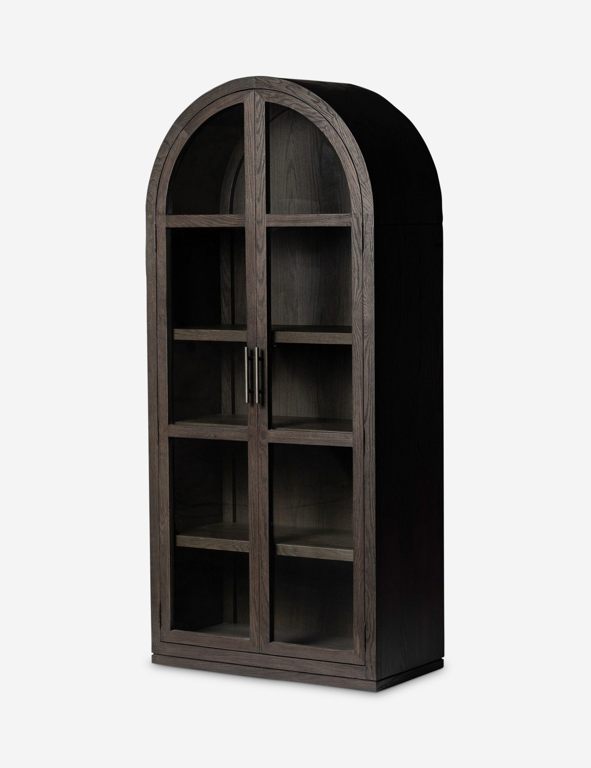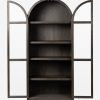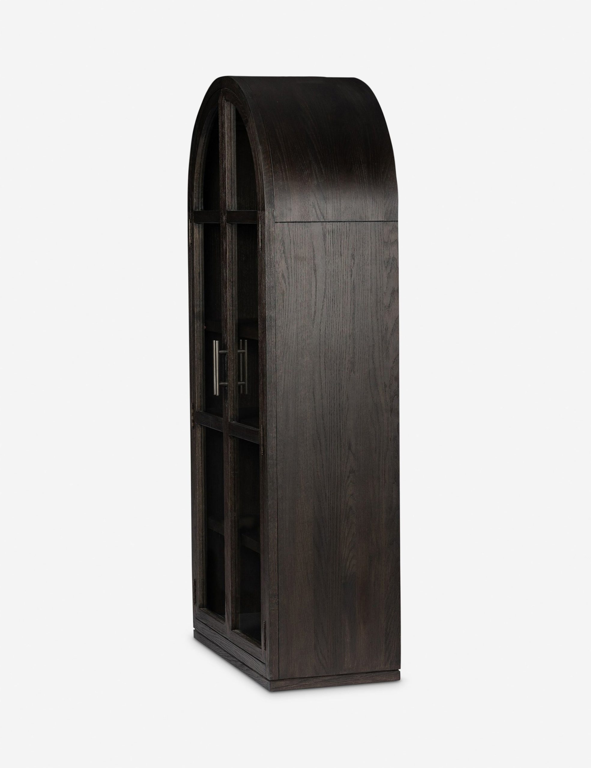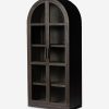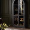 The Capitola cabinet offers the perfect stage for storage and curation. An arched silhouette with a flush plinth base brings a sleek elegance to the understated design, while glass panel doors and a dark finish create a dramatic display for books, decor, and market finds.