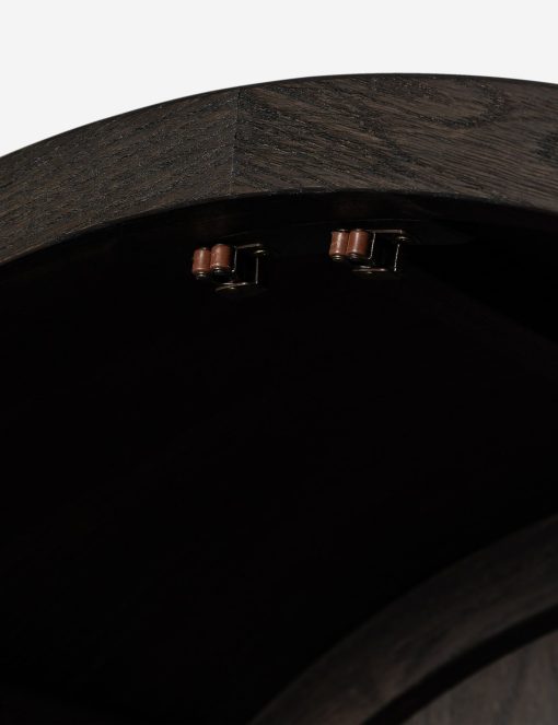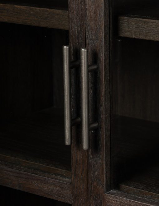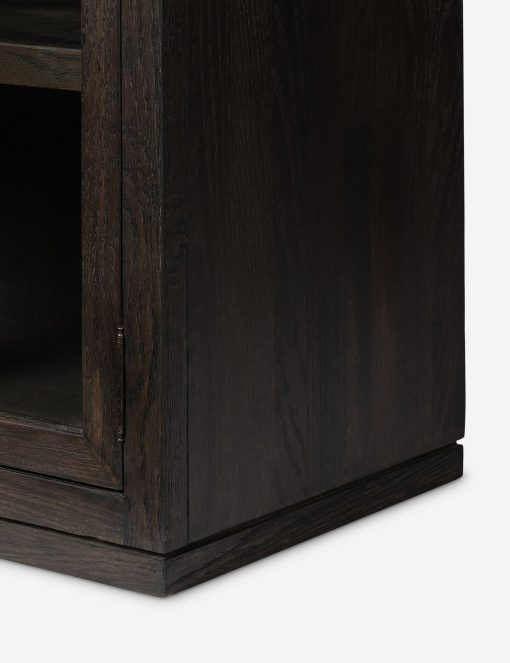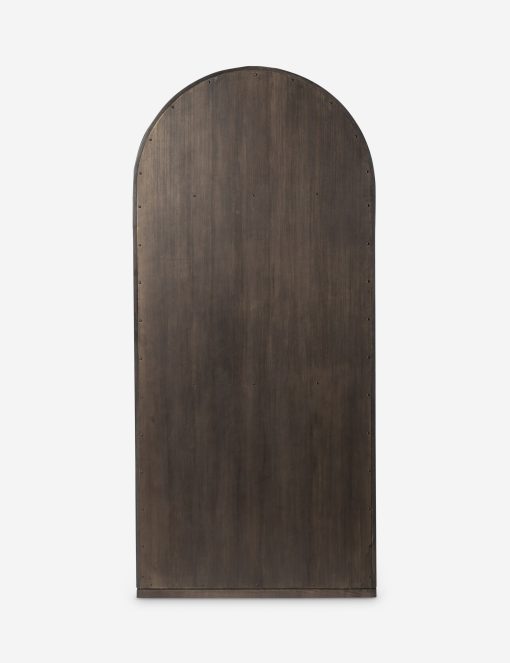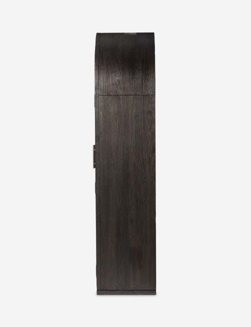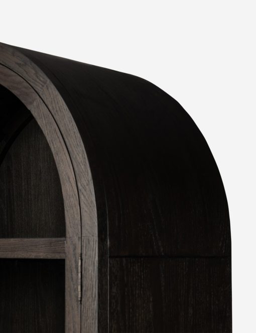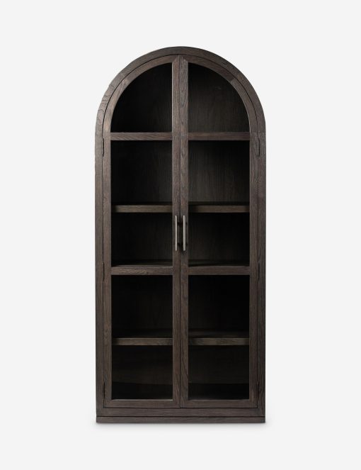 The Capitola cabinet offers the perfect stage for storage and curation. An arched silhouette with a flush plinth base brings a sleek elegance to the understated design, while glass panel doors and a dark finish create a dramatic display for books, decor, and market finds.
