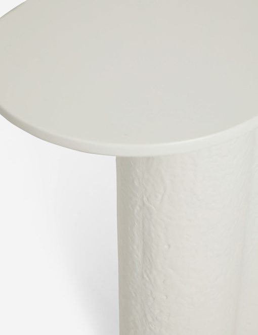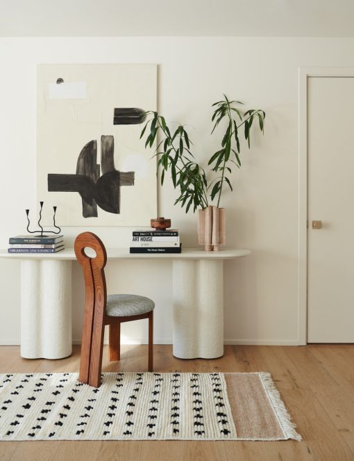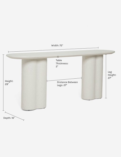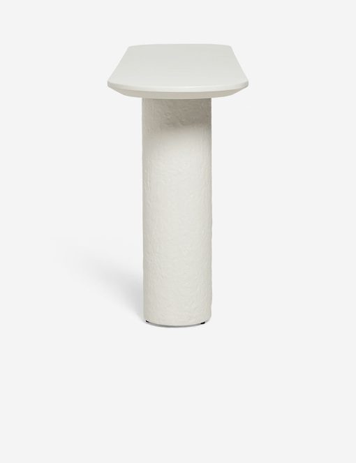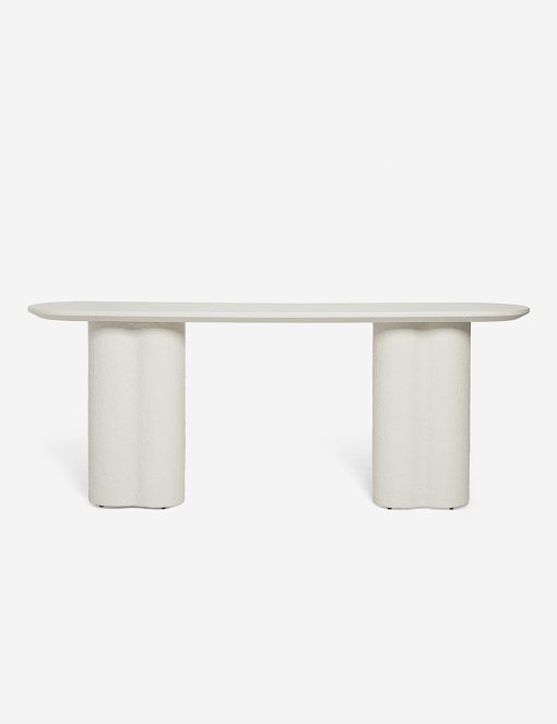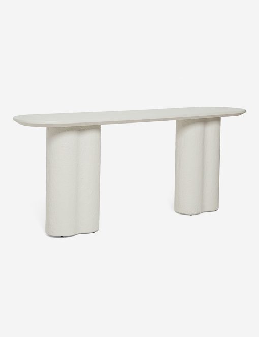 This fiberstone console table offers a soft profile, with its clover-style legs and a polished, oval top. With its rounded edges, this piece is an excellent sofa table, on its own as an entryway table, or outside on your terrace as a bar or buffet. This piece is from our exclusive Sarah Sherman Samuel collaboration and features all the trademarks of her warm, edited style.