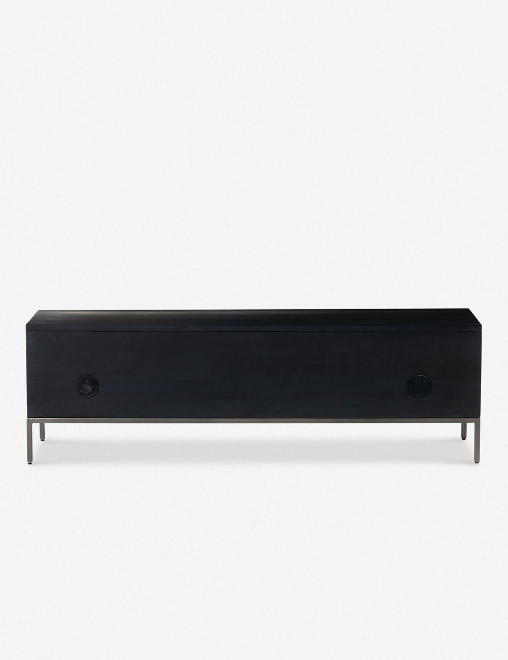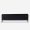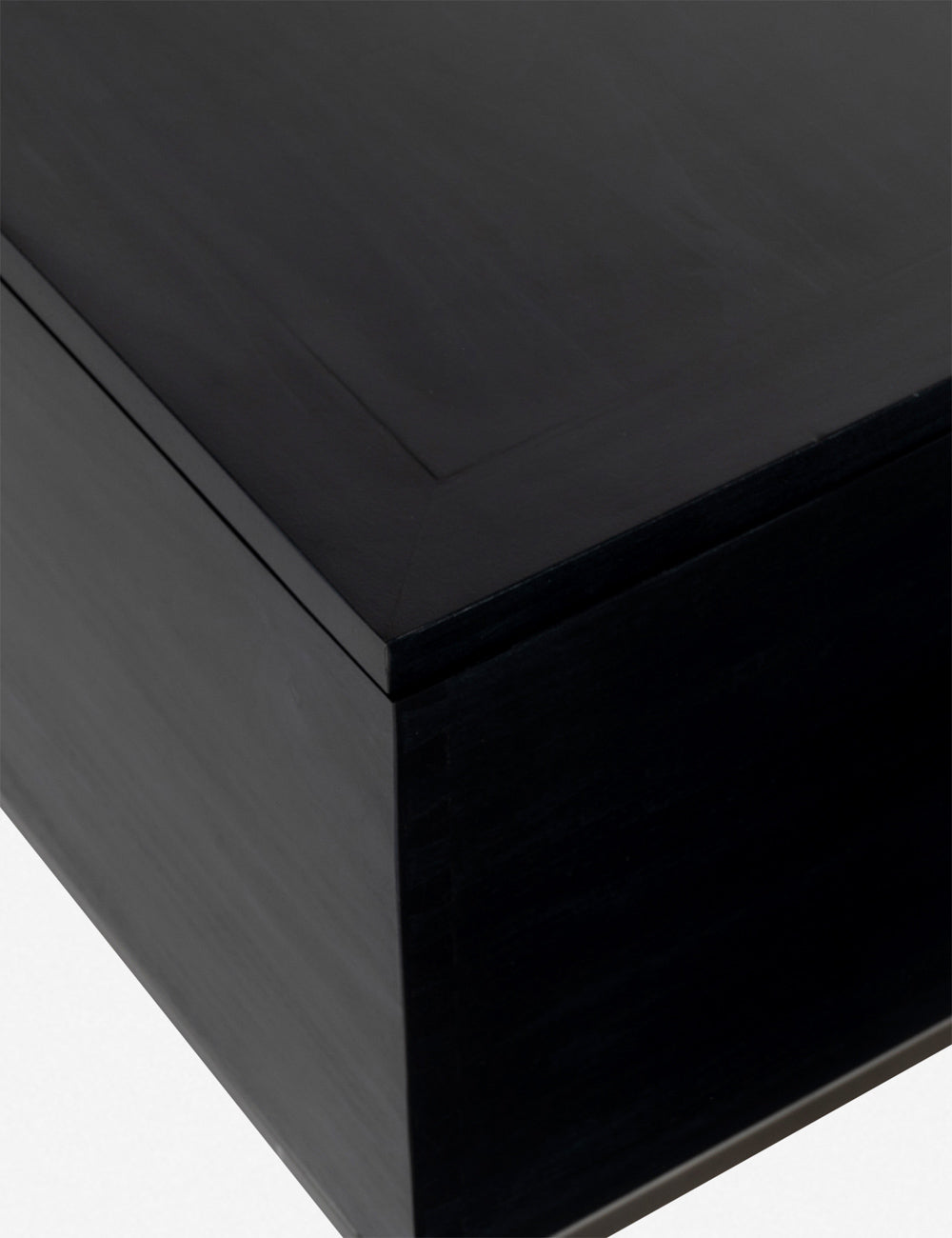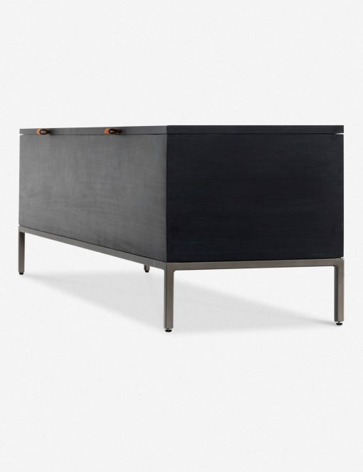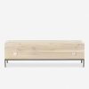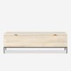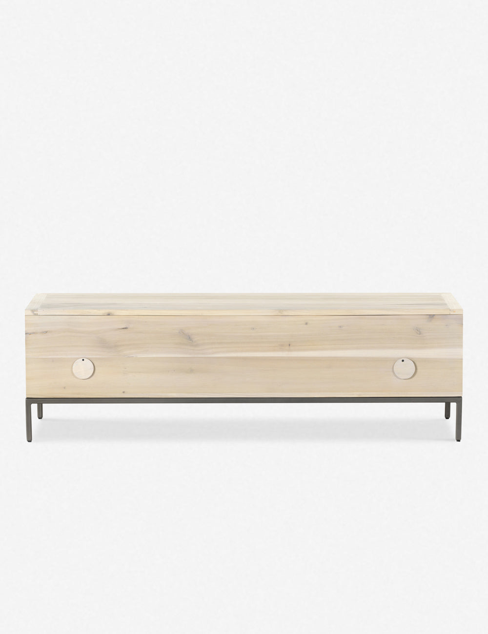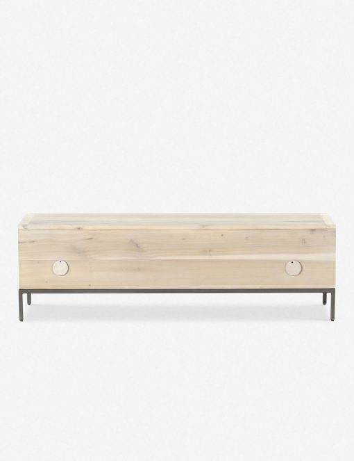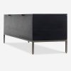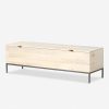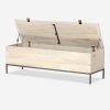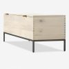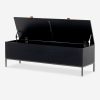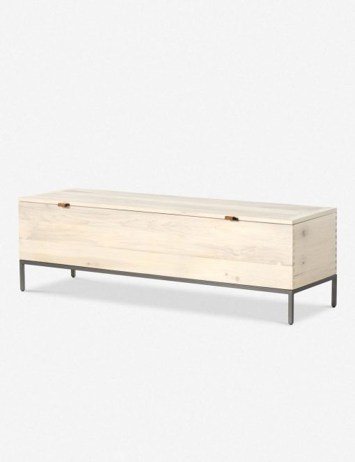 Keep your living space or entry grounded (and super organized) with this sleek trunk. This storage bench features elements of mid-century aesthetics like a poplar wood construction, slim iron base, and top-grain leather pulls.