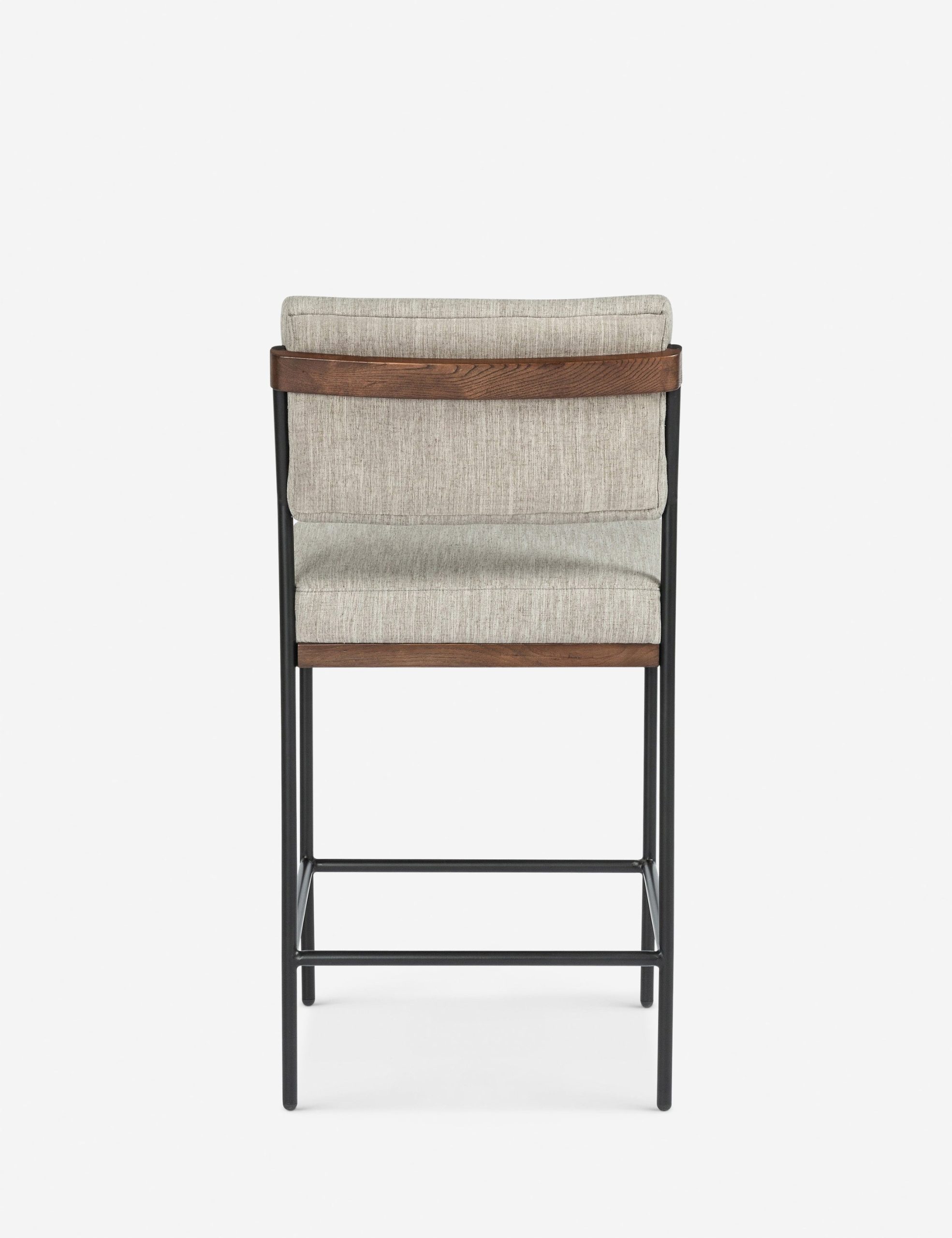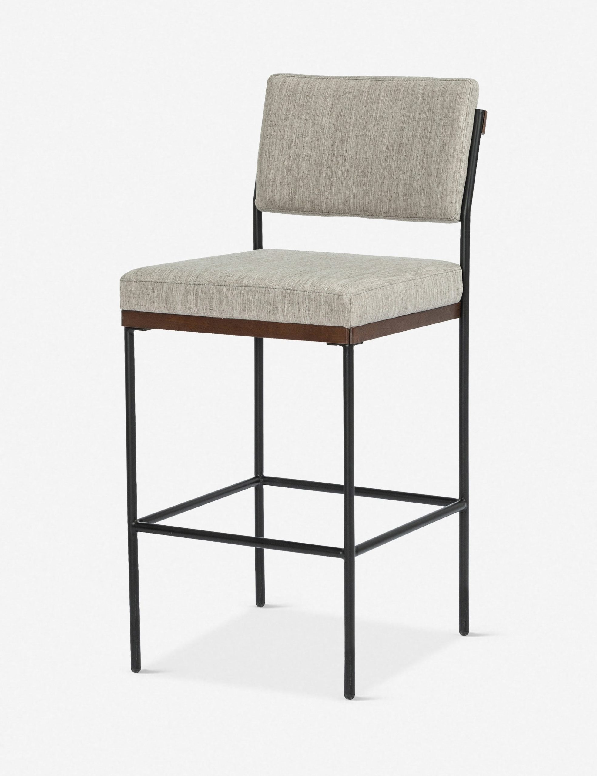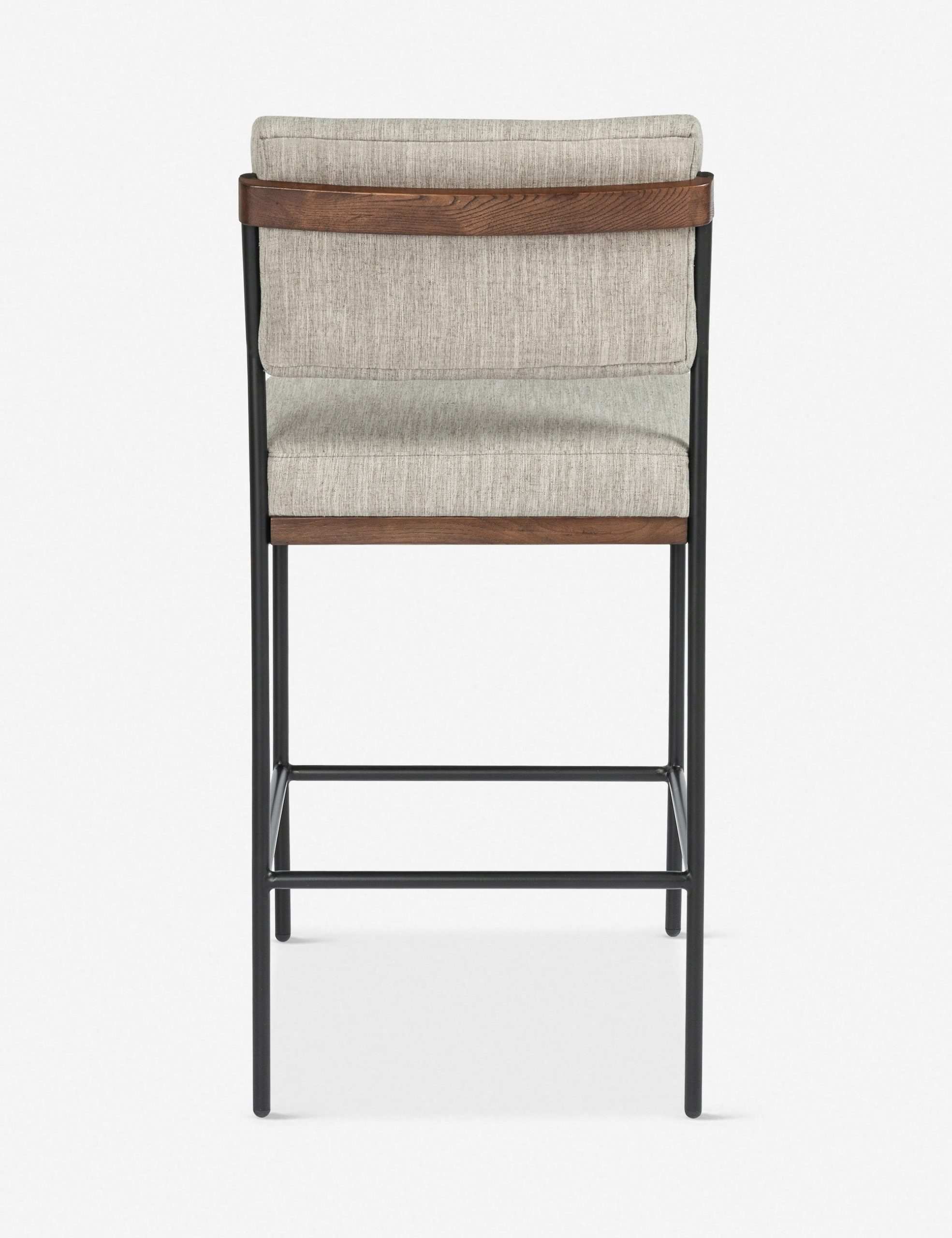 Mixed materials give this bar-height stool a distinctly modern look. The armless bar chair features black iron legs, a flannel-colored fabric seat, and floating back with a curved wood accent piece.
