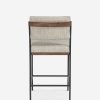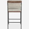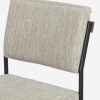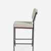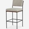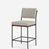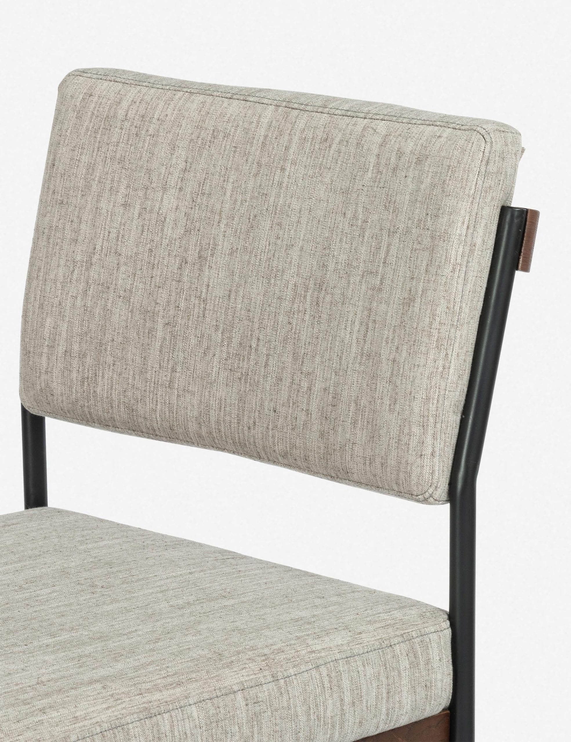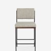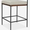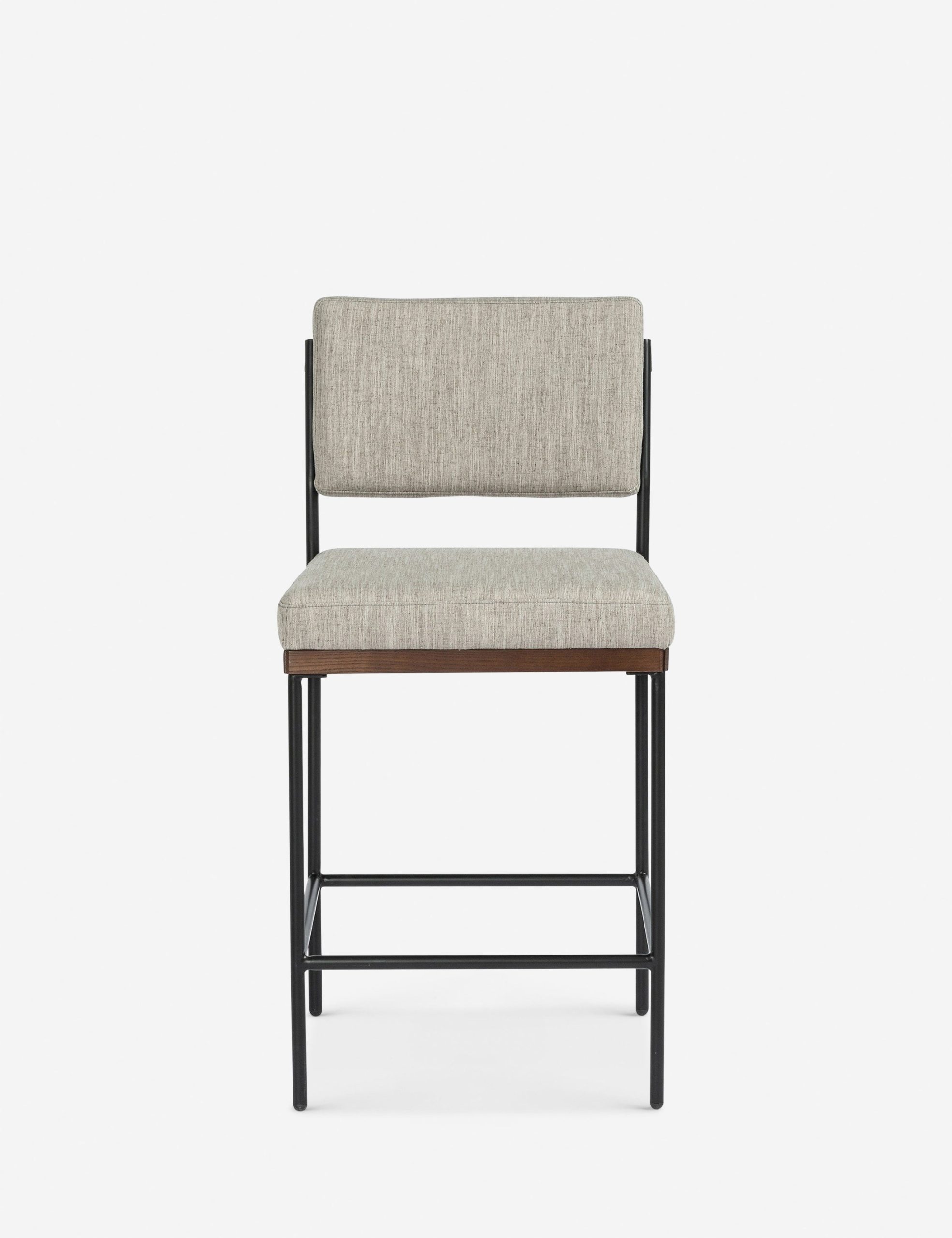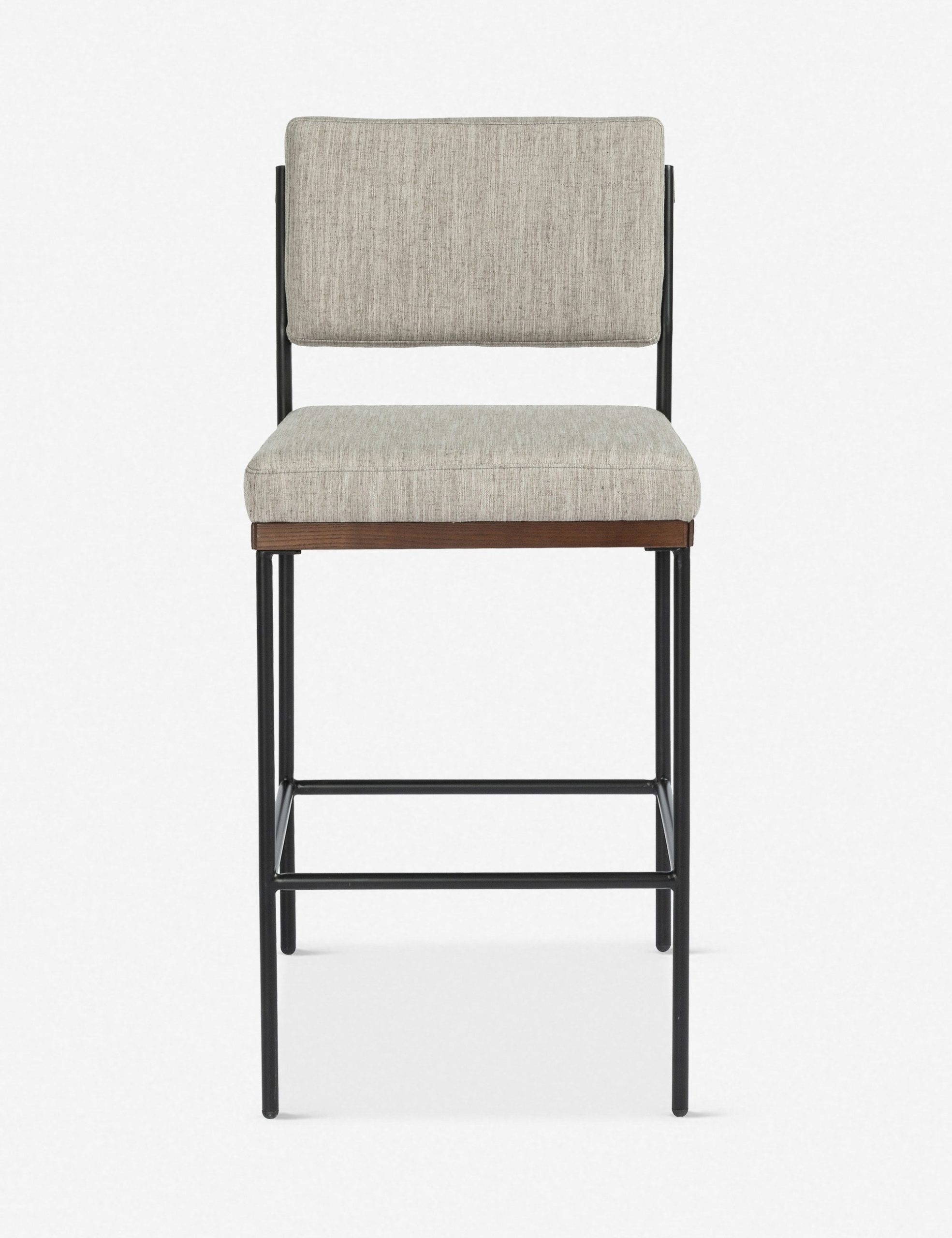Mixed materials give this bar-height stool a distinctly modern look. The armless bar chair features black iron legs, a flannel-colored fabric seat, and floating back with a curved wood accent piece.
