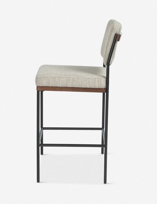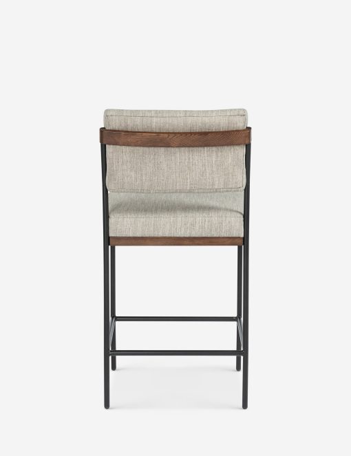Mixed materials give this bar-height stool a distinctly modern look. The armless bar chair features black iron legs, a flannel-colored fabric seat, and floating back with a curved wood accent piece.