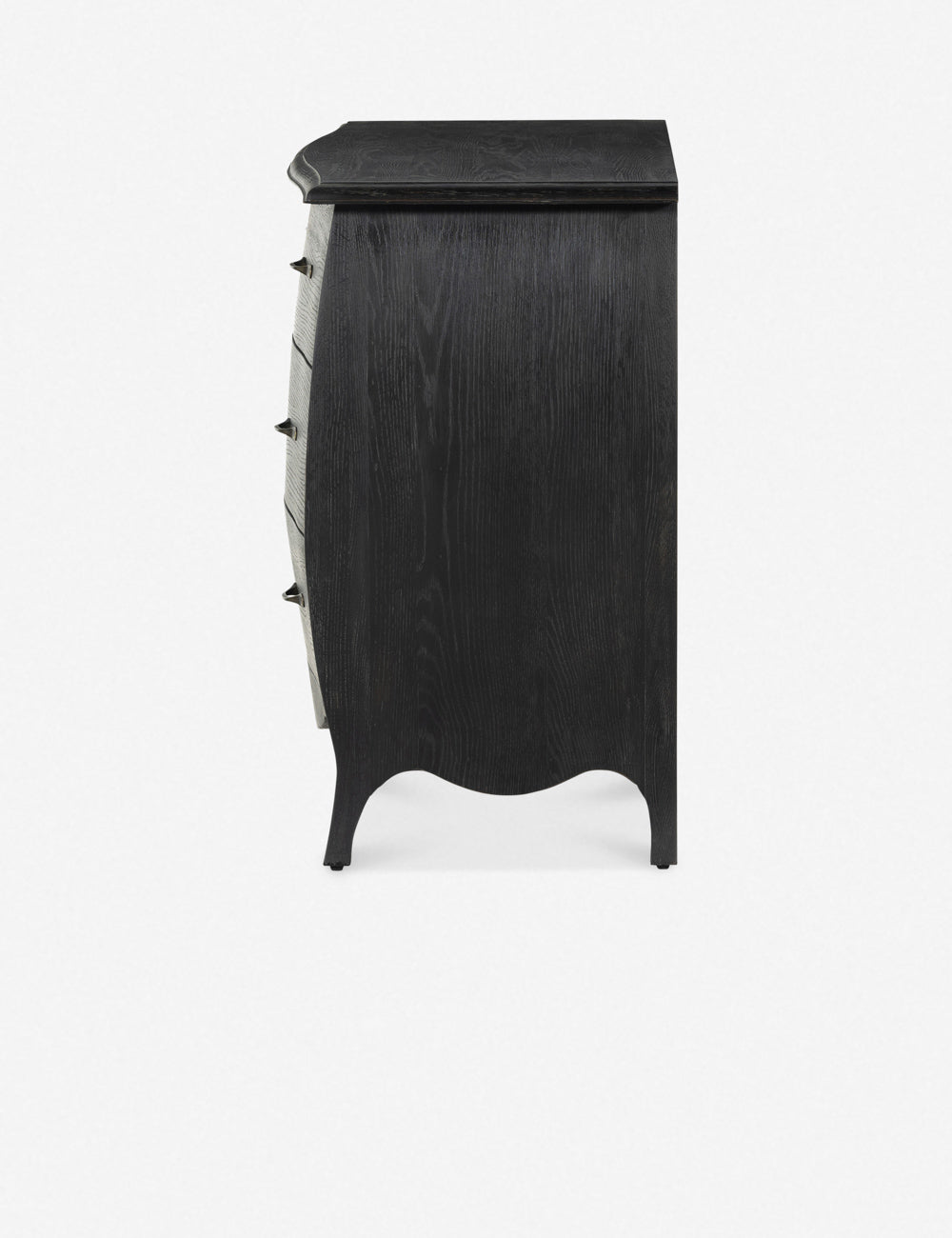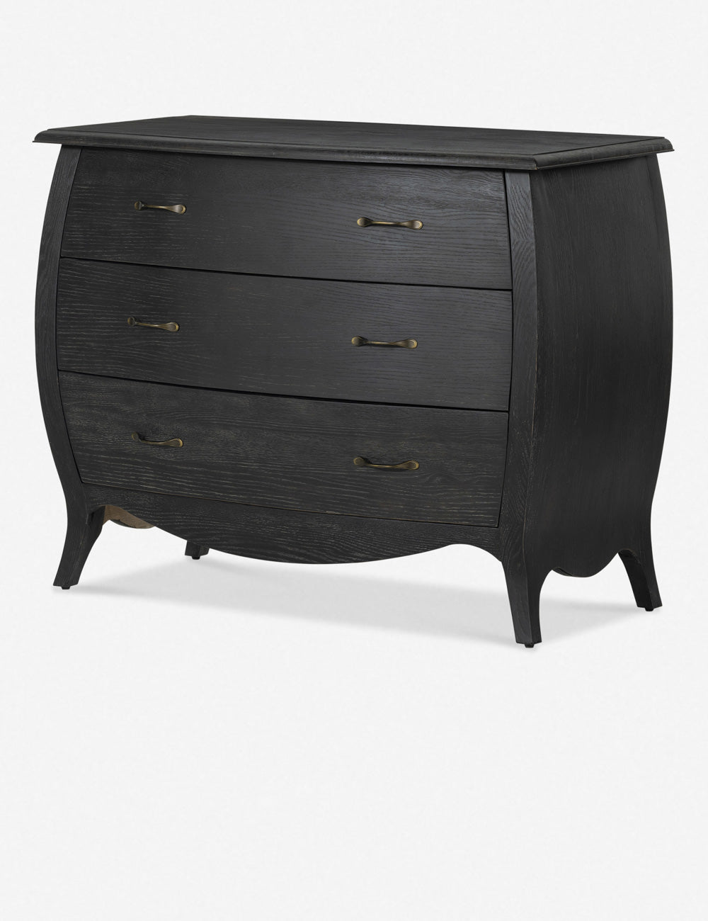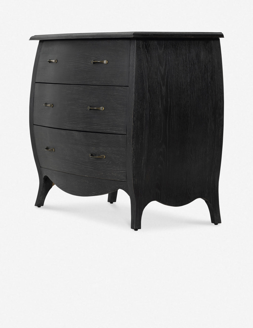 Curved lines and a shapely silhouette fashion this dresser with a whimsical air. Finished with a dark, lightly distressed finish and burnished drawer pulls, this chest of drawers inspires a timeless tone that will instantly elevate your bedroom look.